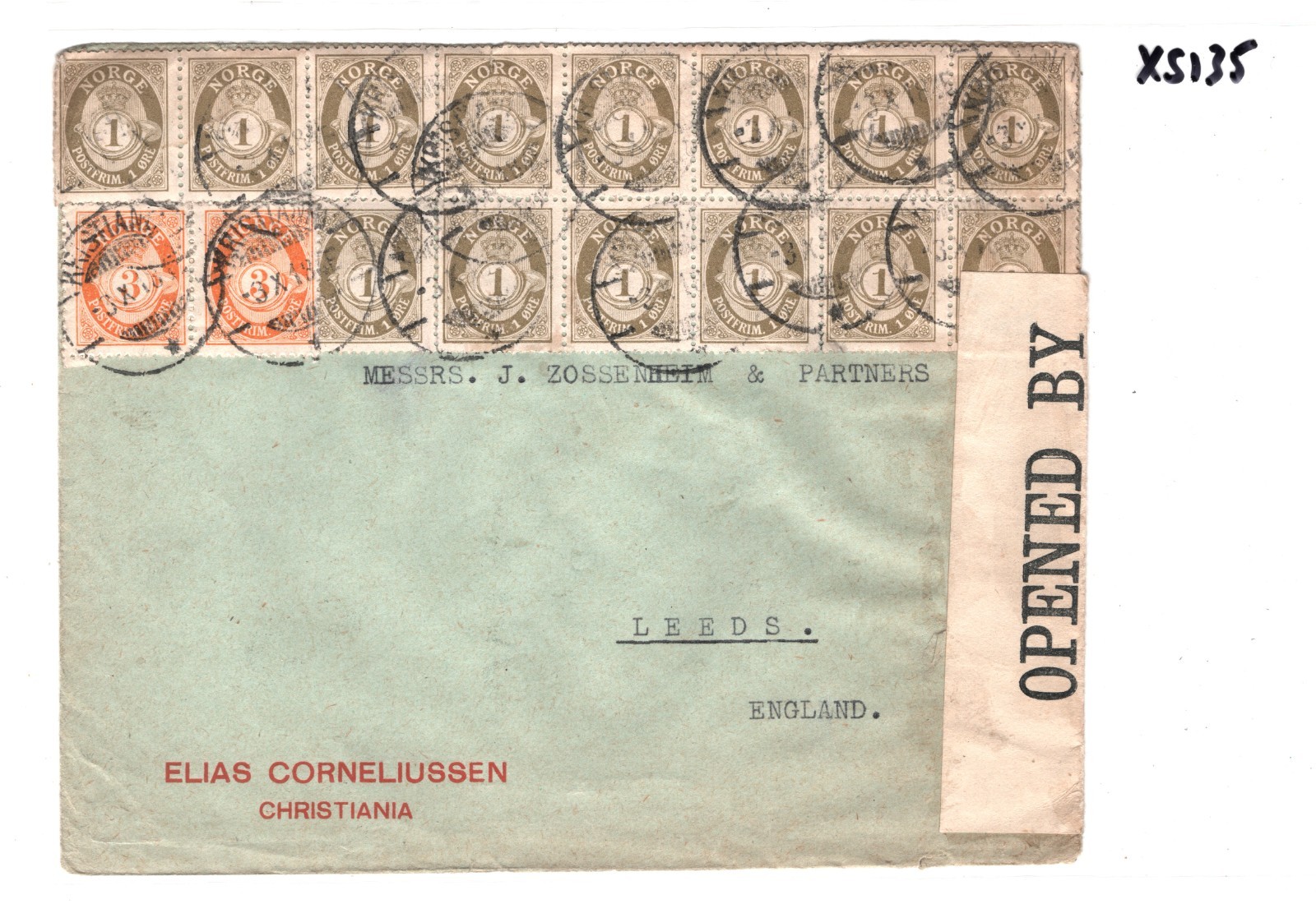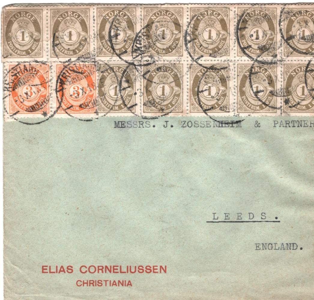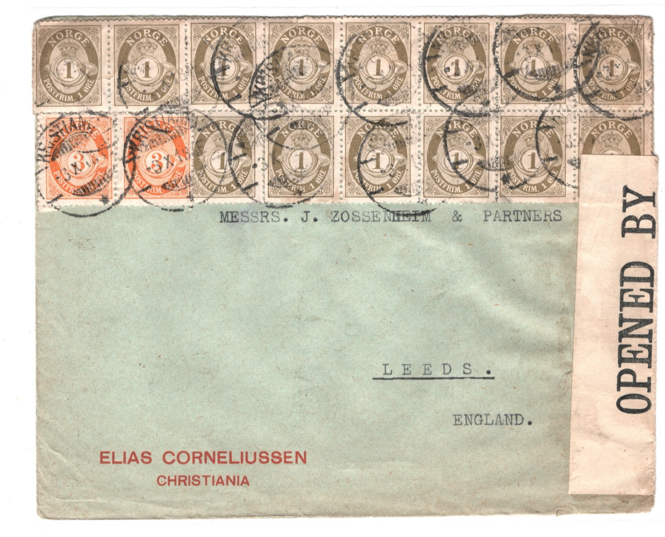 NORWAY Cover Oslo Reg *2-COLOUR* POSTHORN Block Franking WW1 CENSOR Leeds XS135