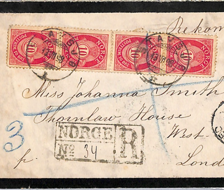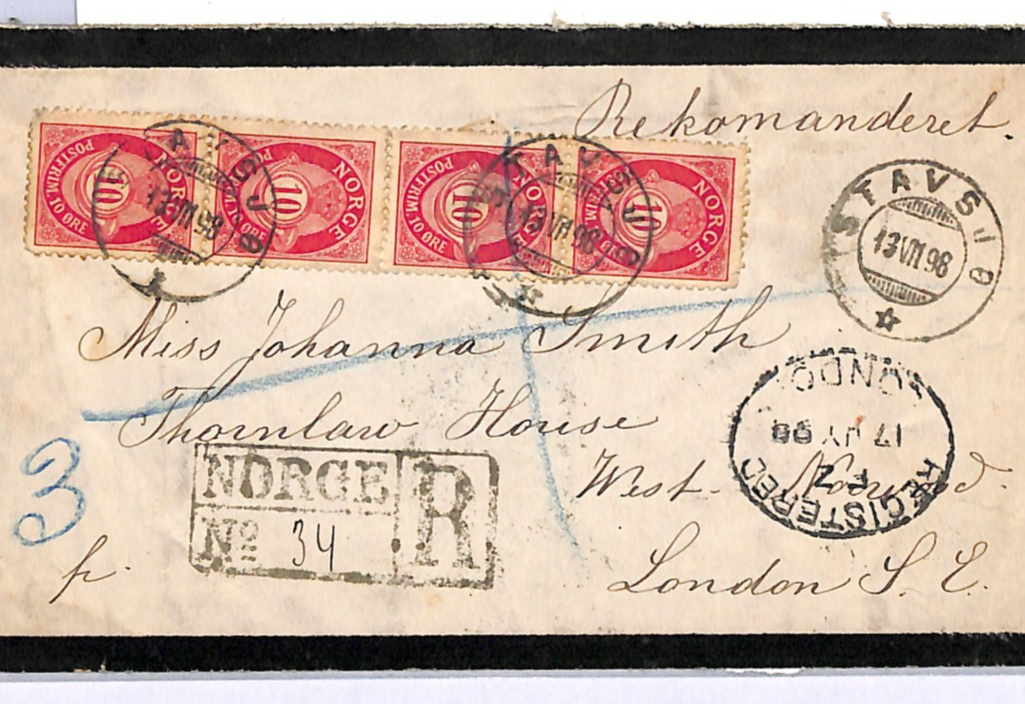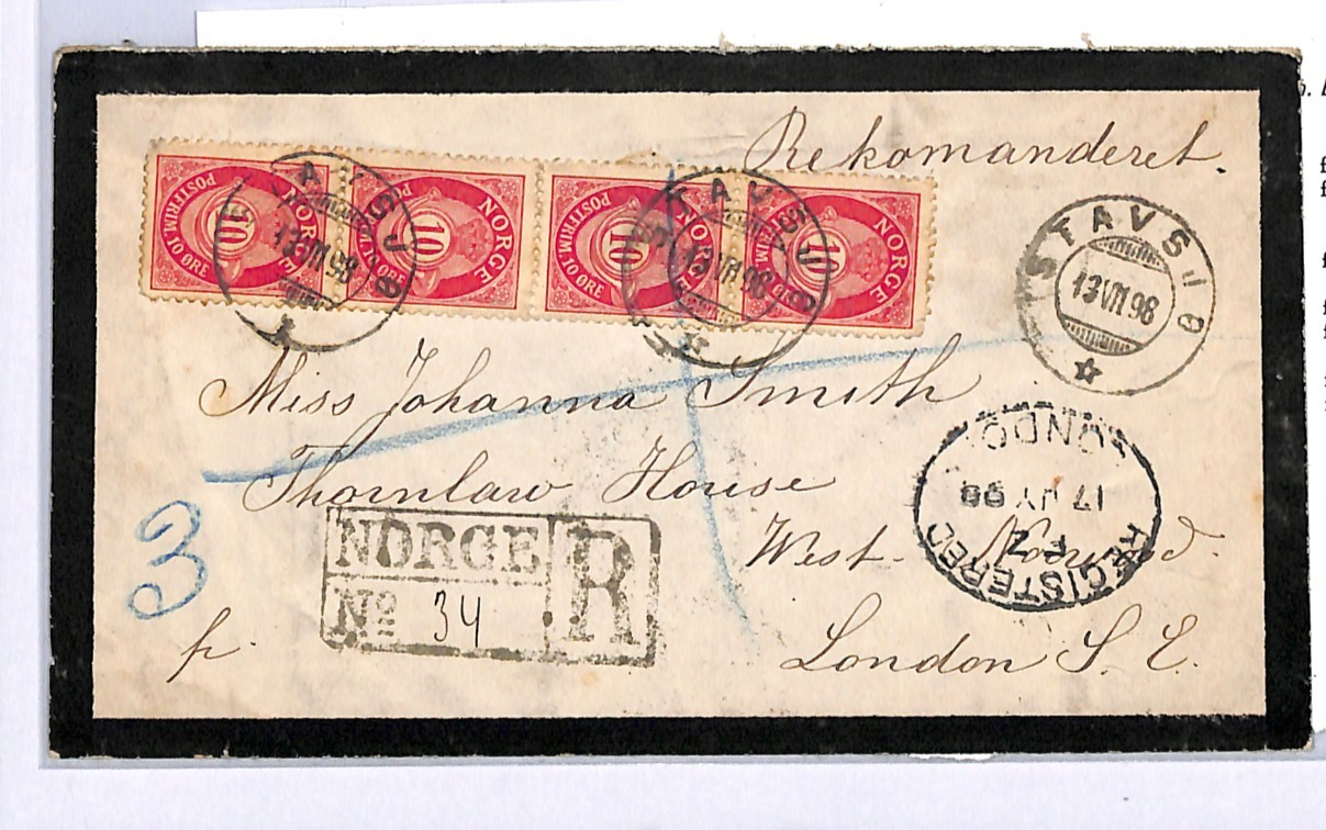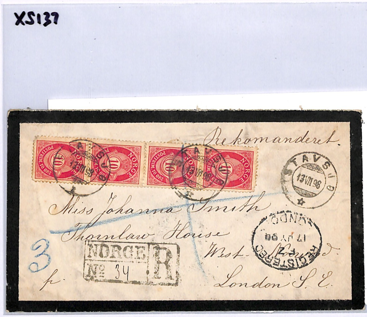 NORWAY Cover *STAVSJO* Reg Railway TPO? 1898 POSTHORN STRIP Denmark London XS137