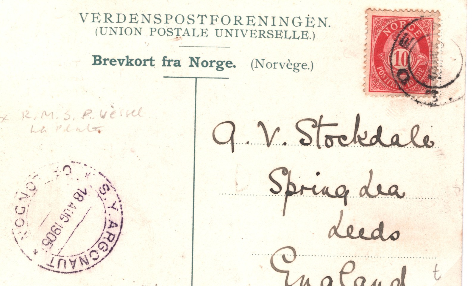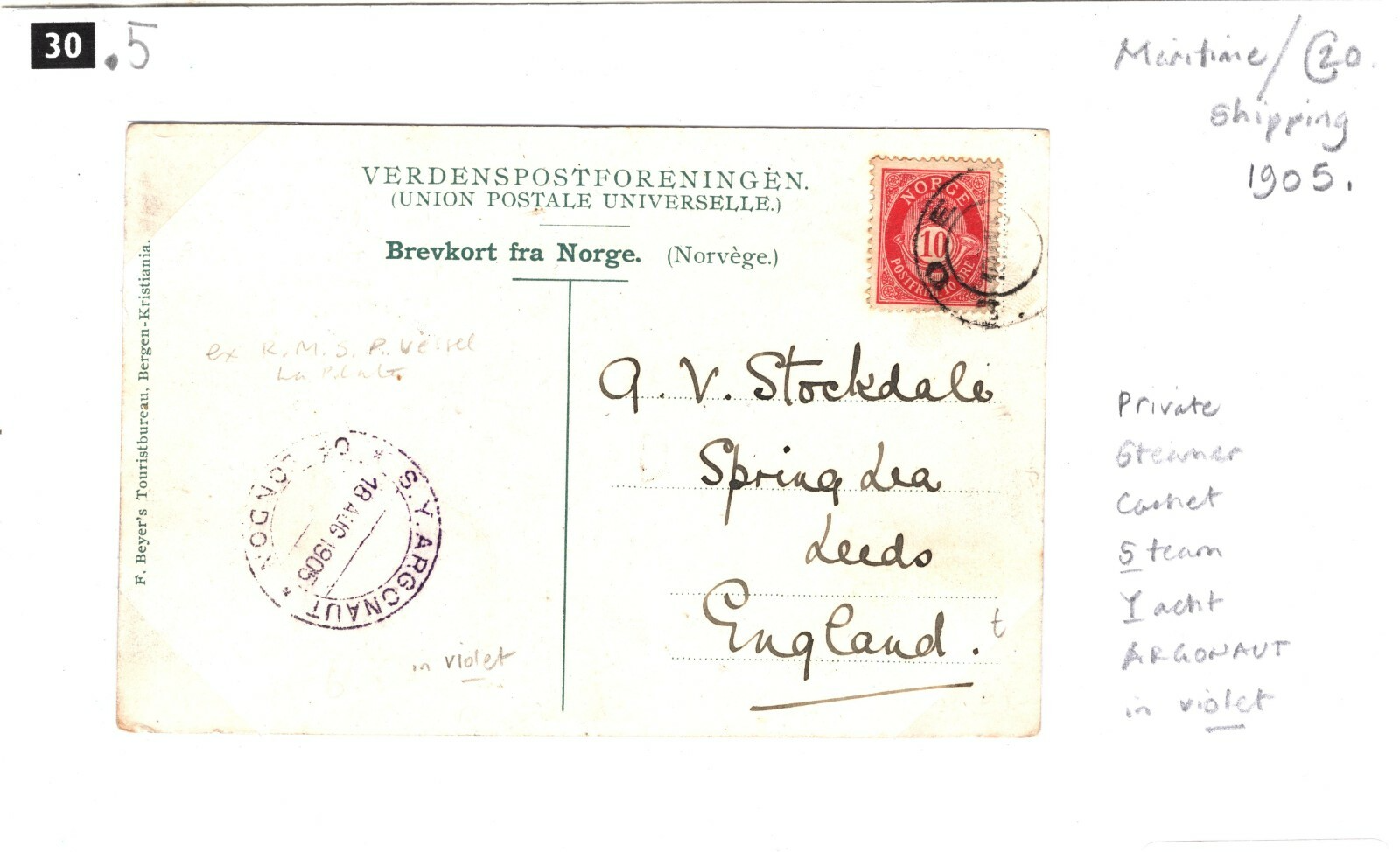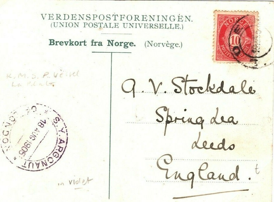 NORWAY Postcard GB Ship STEAM YACHT *ARGONAUT* CDS Violet Cancel 1905 Leeds 30.5