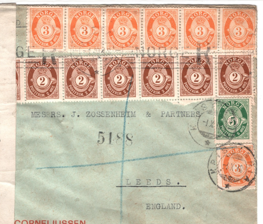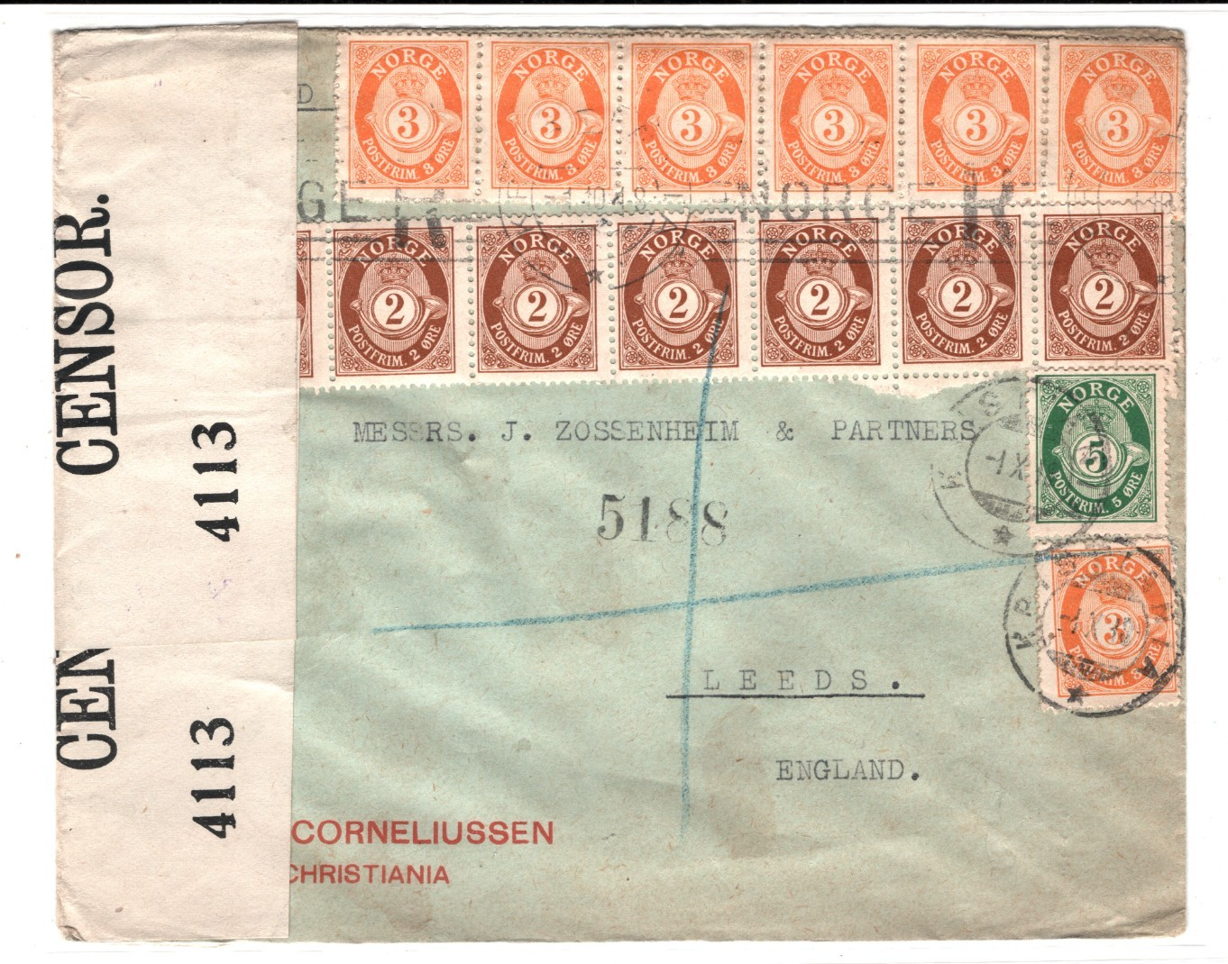 NORWAY WW1 Cover *3-COLOUR FRANKING* Strips CENSOR Registered 1918 Leeds XS126