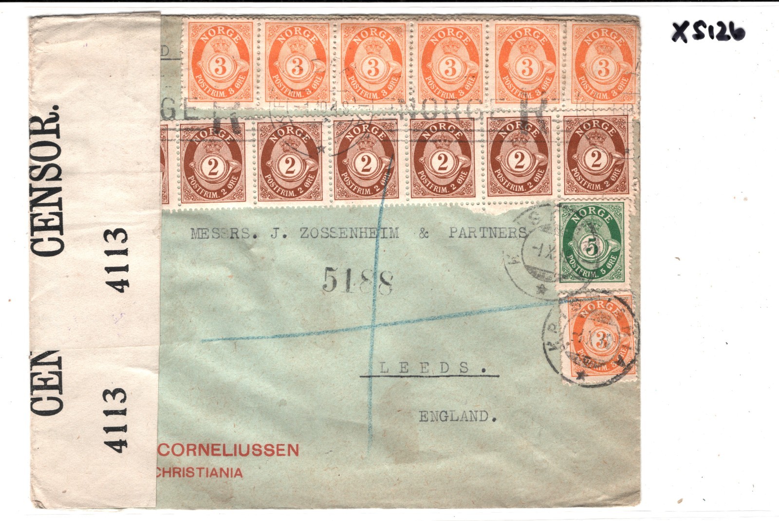 NORWAY WW1 Cover Kristiania Registered Block Franking GB CENSOR Leeds 1918 XS126