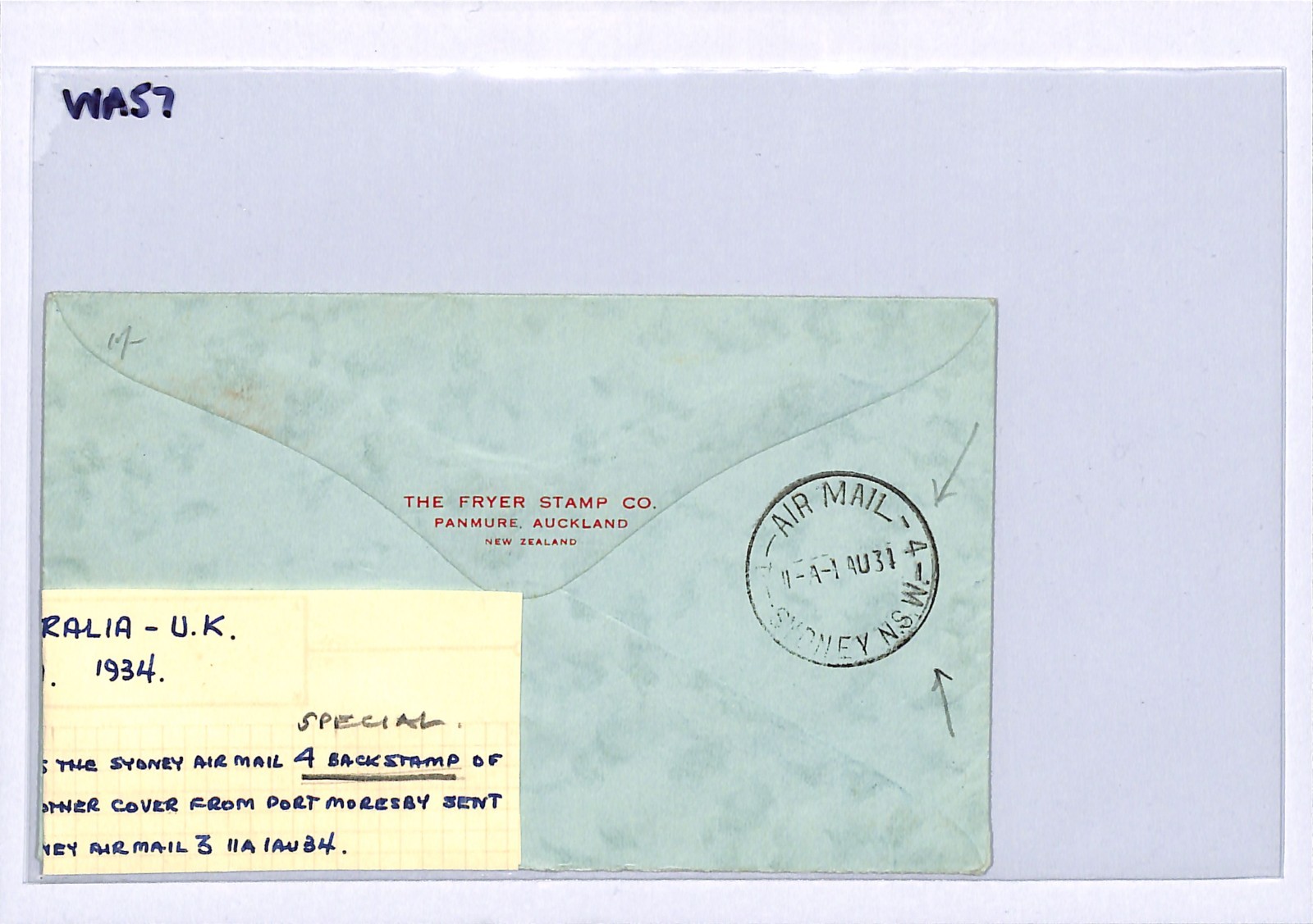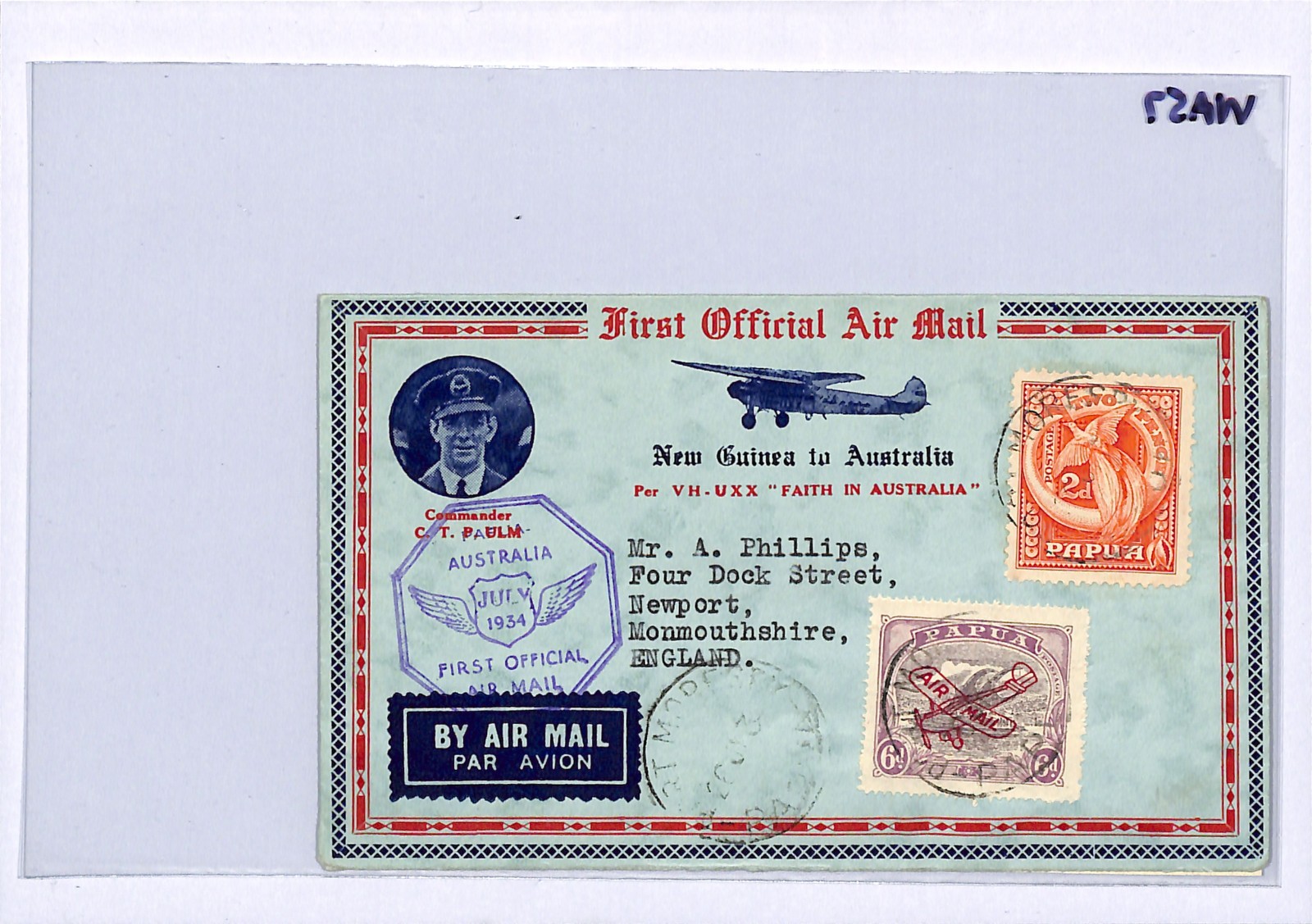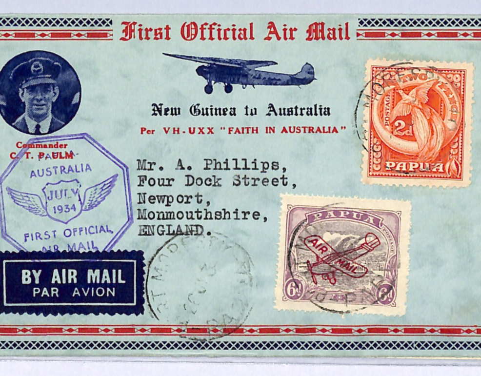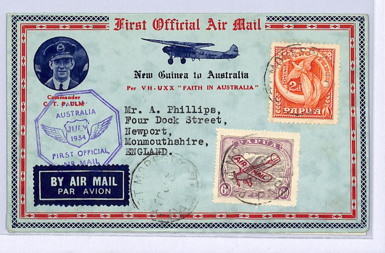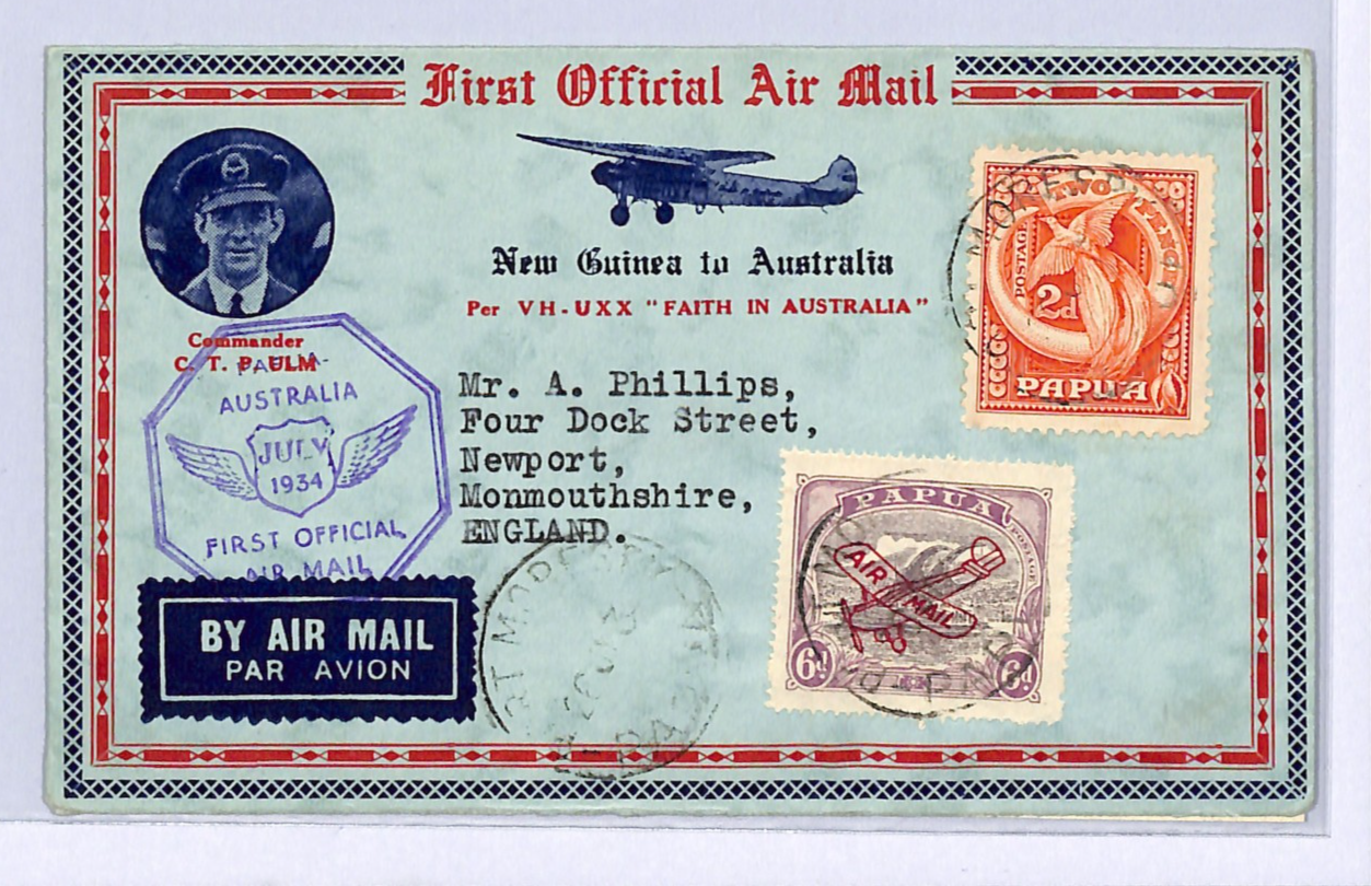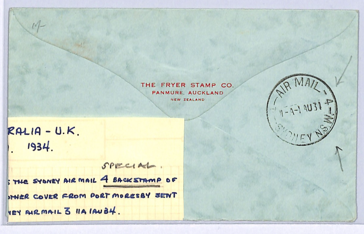 PAPUA/AUSTRALIA Air Mail FIRST FLIGHT 1934 *4* SPECIAL BACKSTAMP GB Newport WA53
