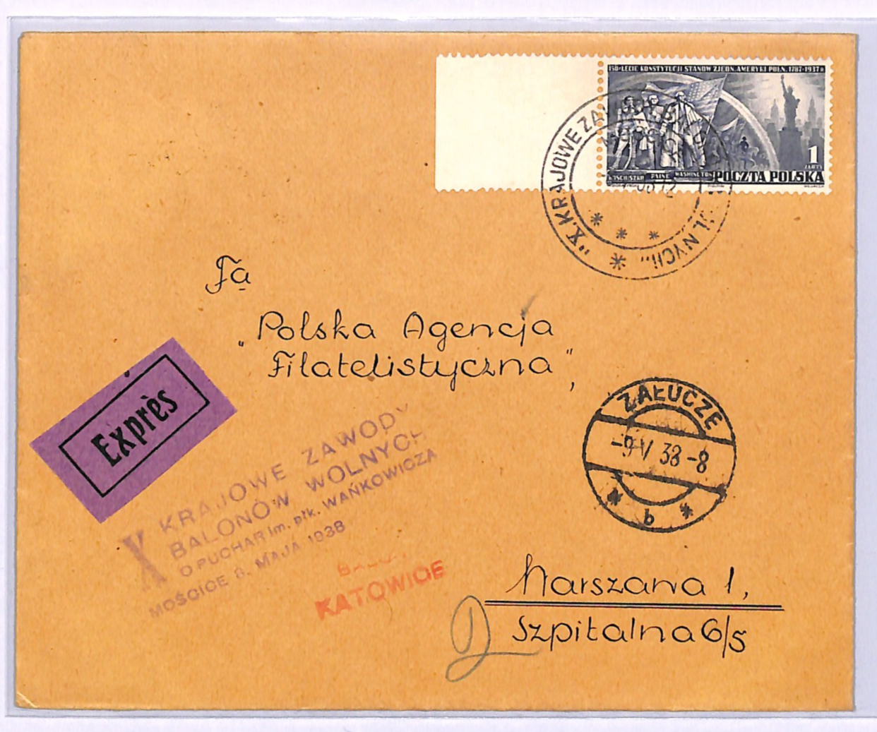 POLAND BALLOON MAIL Competition Cover Katowice ZAŁUCZE Warsaw 1938 EXPRESS WB11