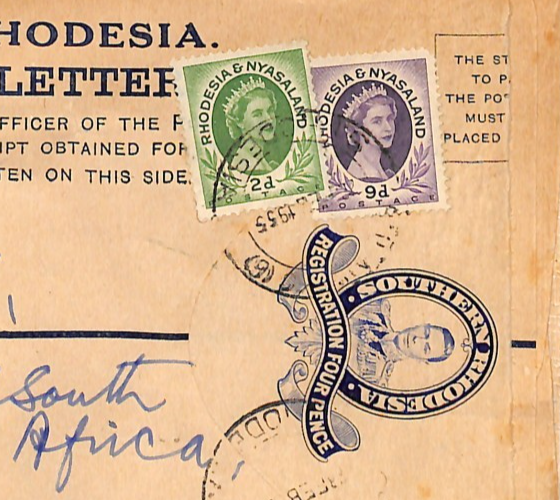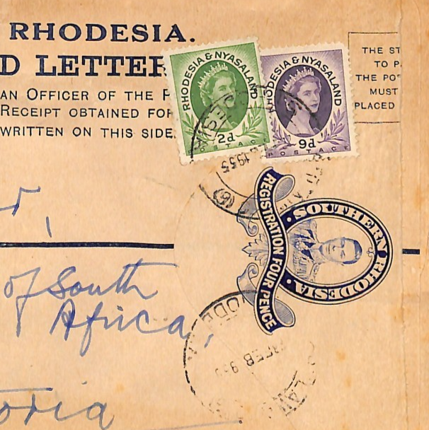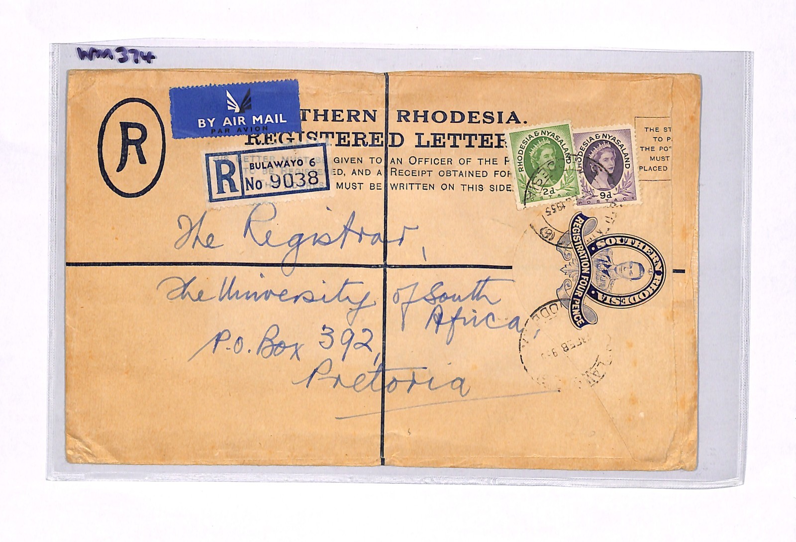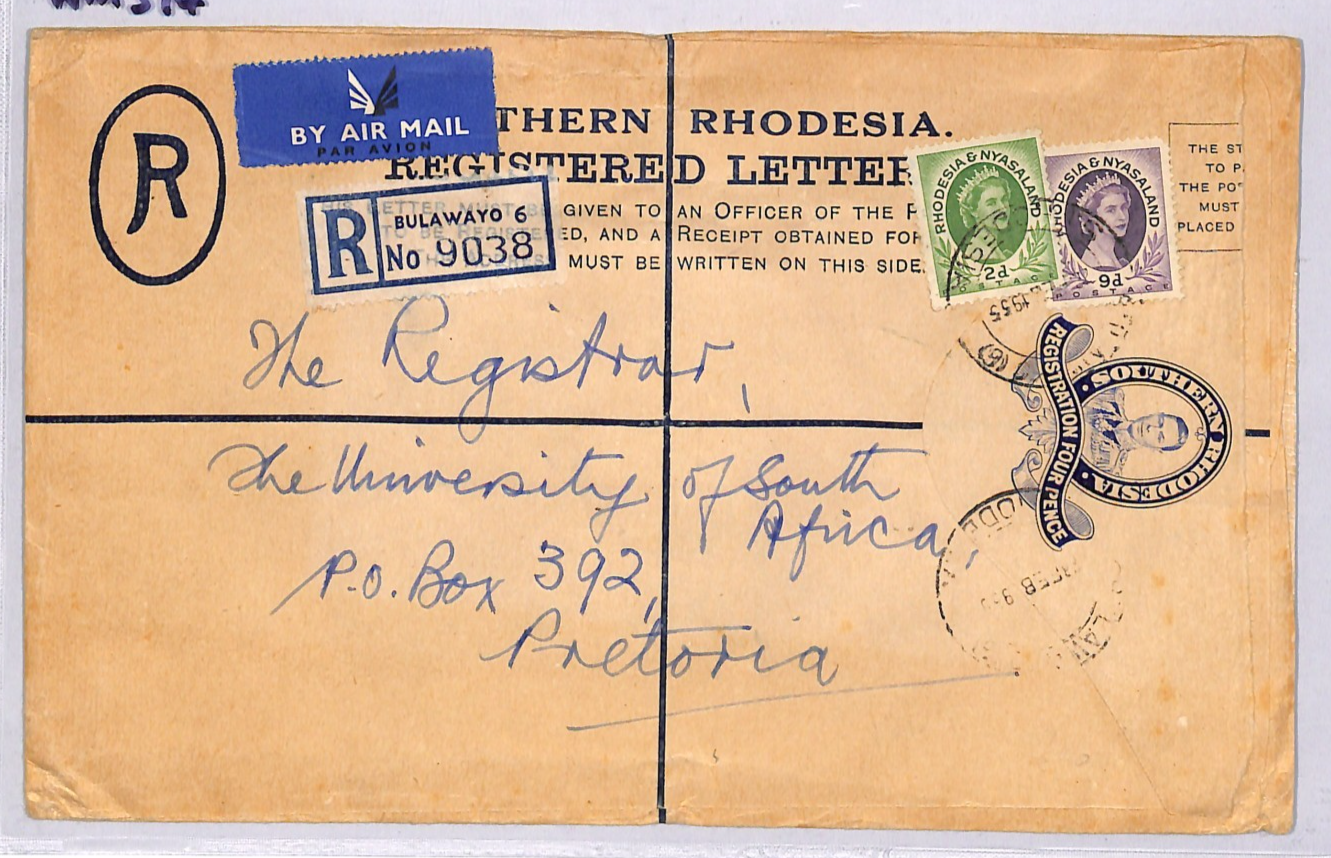 RHODESIA & NYASALAND Air Mail QEII Cover KGVI Stationery Bulawayo CYRENE MISSION Registered South Africa Pretoria 1955 MISSIONARY WM374