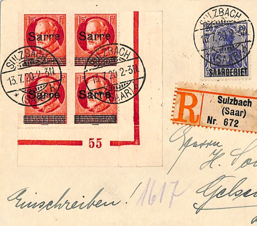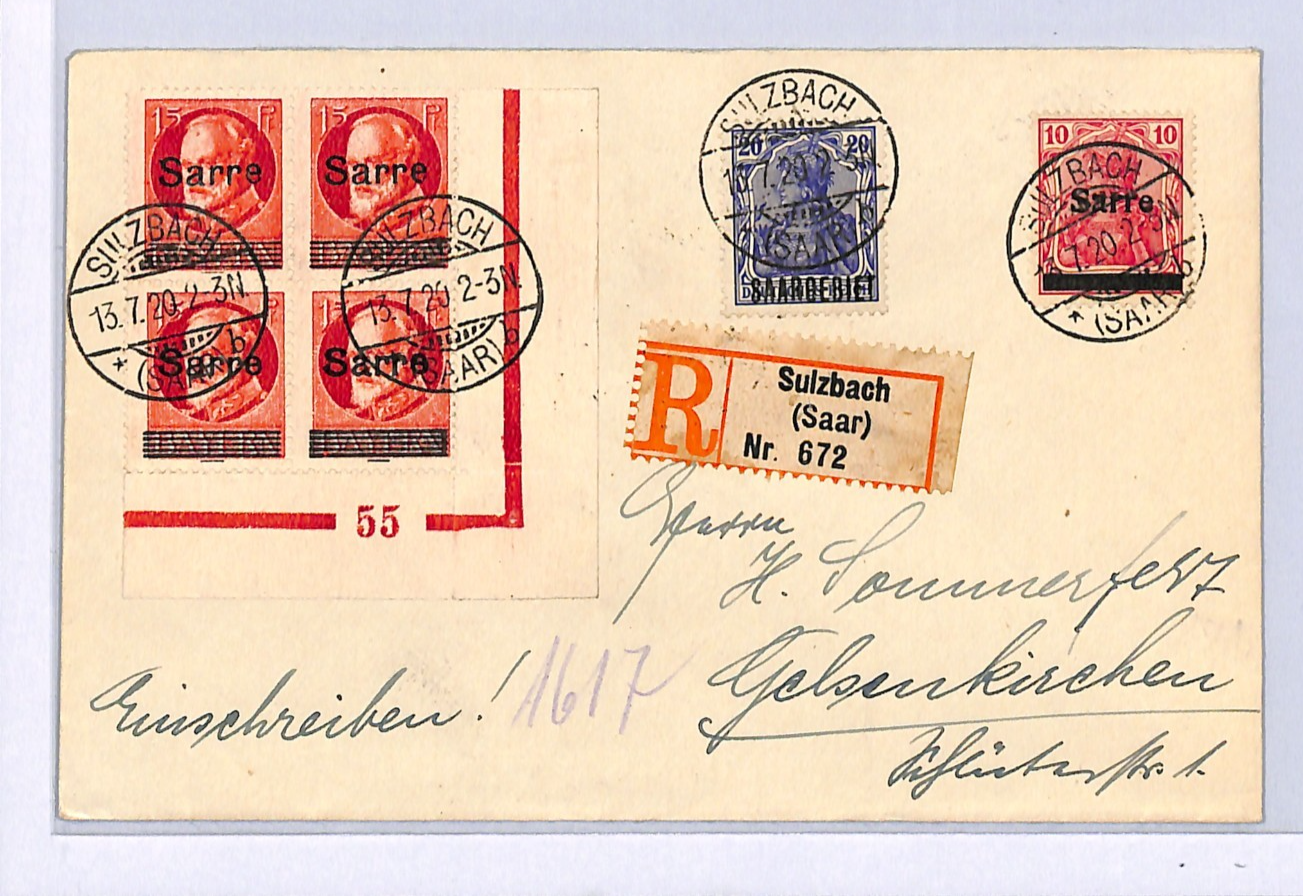 SAAR Cover *Sarre* Overprint Corner Block{4} 1920 SAARGEBIET Mixed Franking XM68