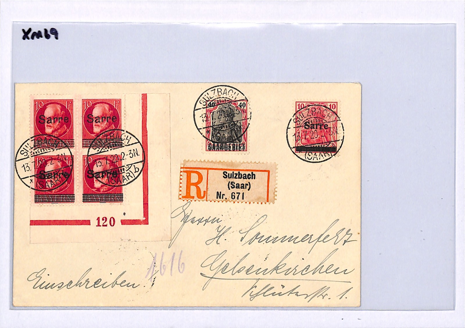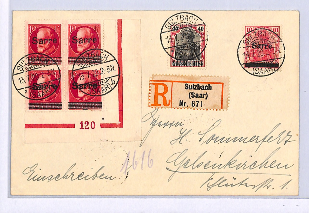 SAAR Cover SARRE BAVARIA Overprints Block{4} SAARGEBIET Sulzbach Reg Gelsenkirchen 1920 XM69