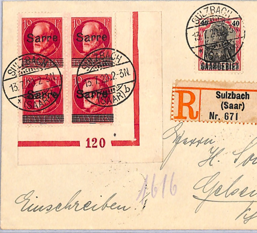 SAAR Cover *Sarre* Overprint Corner Block{4} 1920 SAARGEBIET Mixed Franking XM69