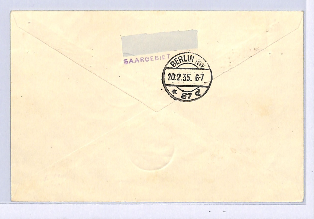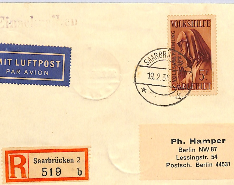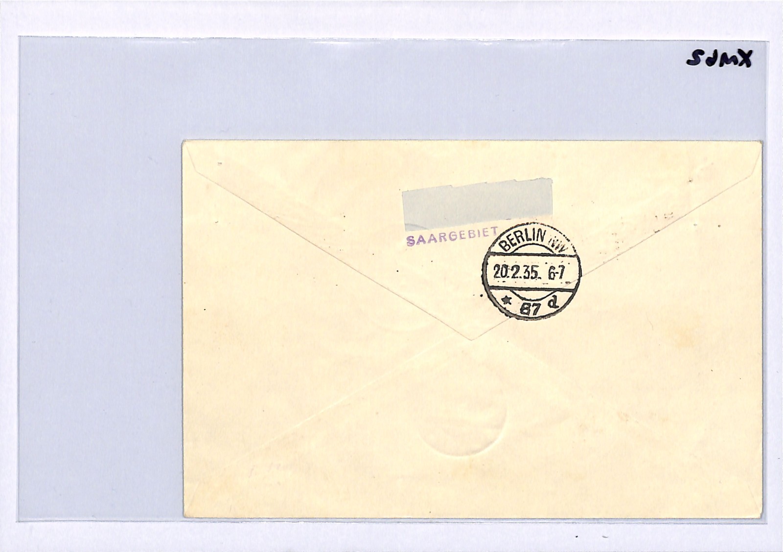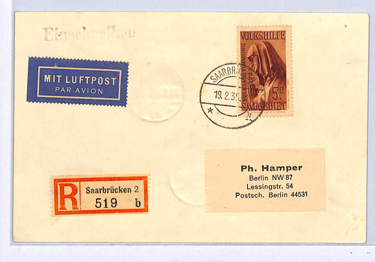 SAAR Cover *VOLKSHILFE* (1934) 5f Top HIGH VALUE Plebiscite "1935" Overprint Used 1935 Registered Saarbrücken Berlin Air Mail XM62