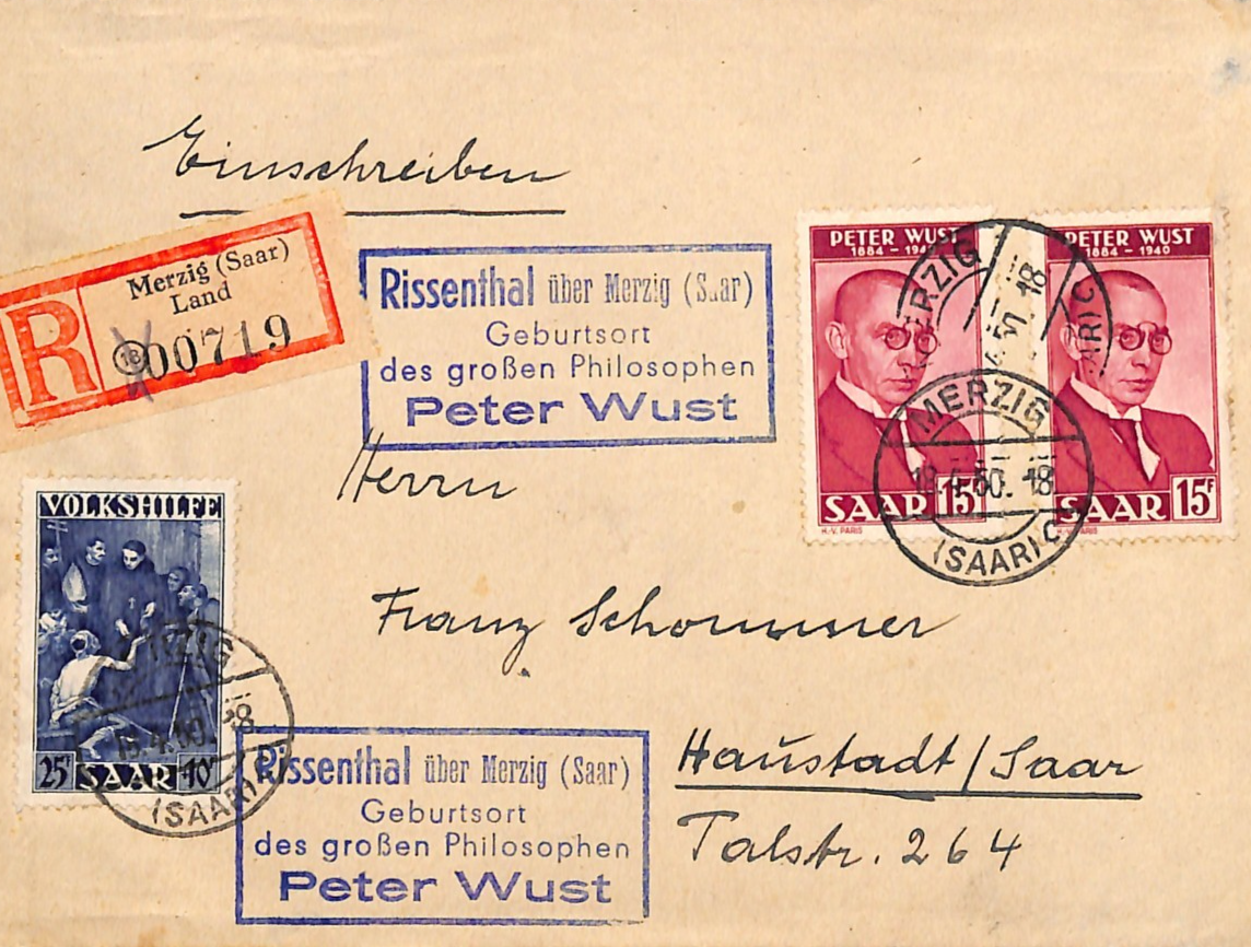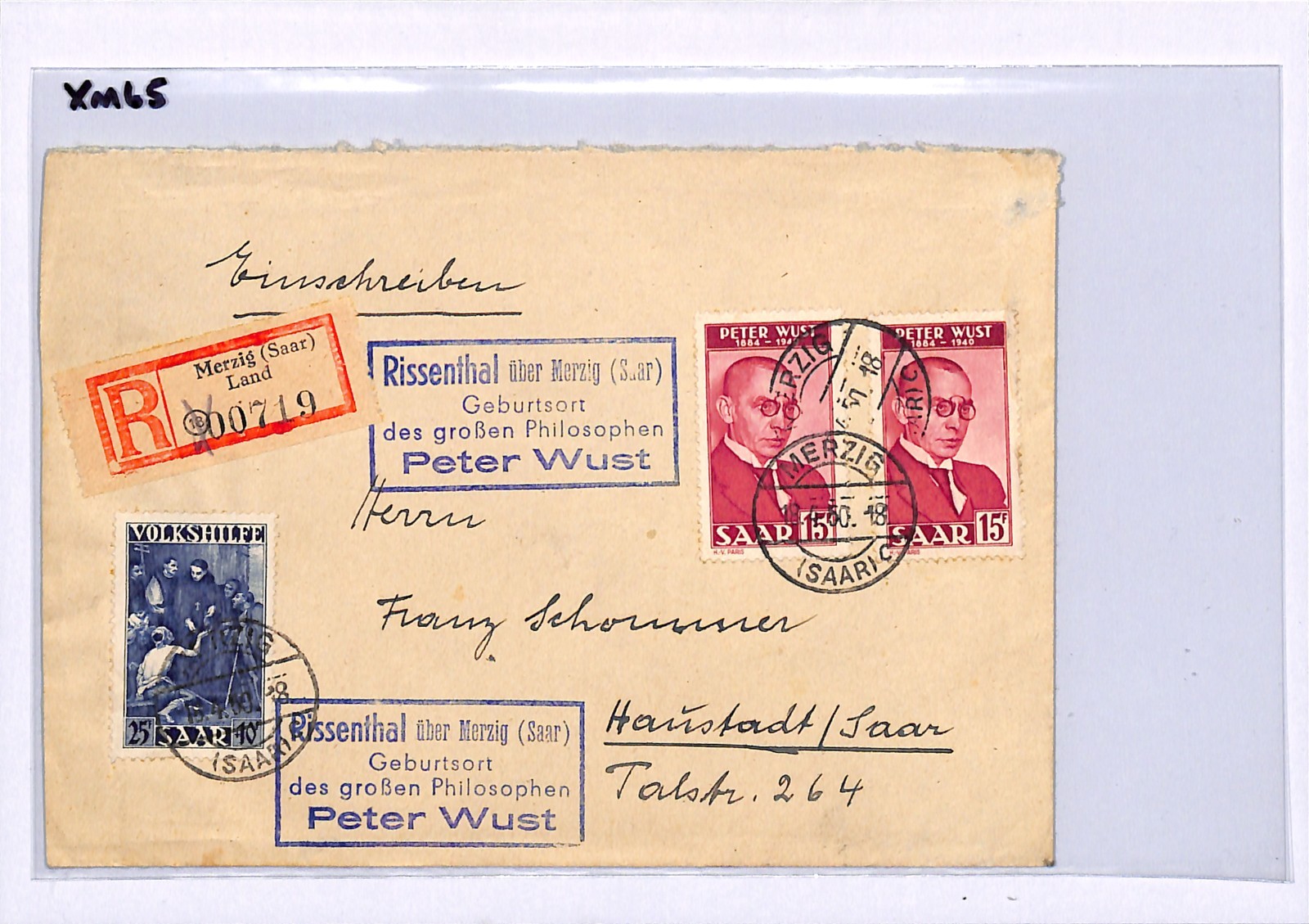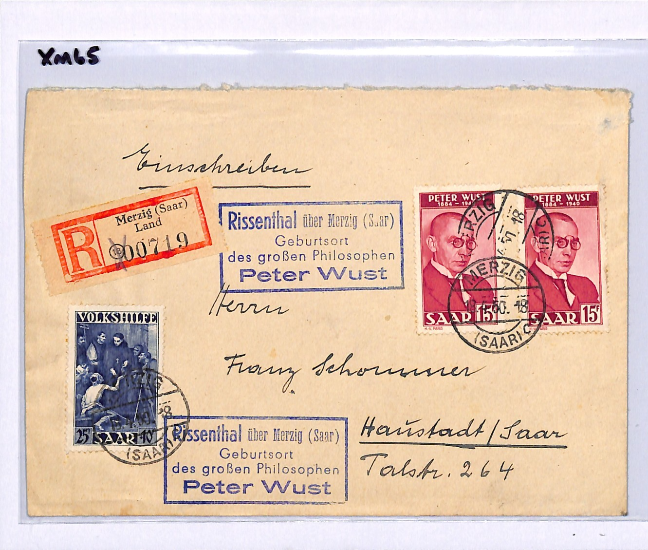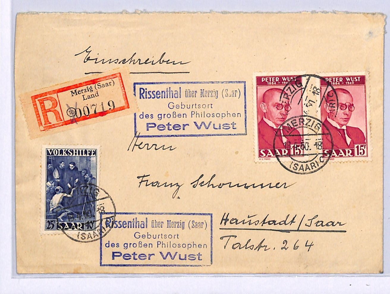 SAAR Cover *VOLKSHILFE* (1949) 25+10f Used 1950 Cover PETER WUST Pair Merzig Registered Haustadt {samwells}XM65