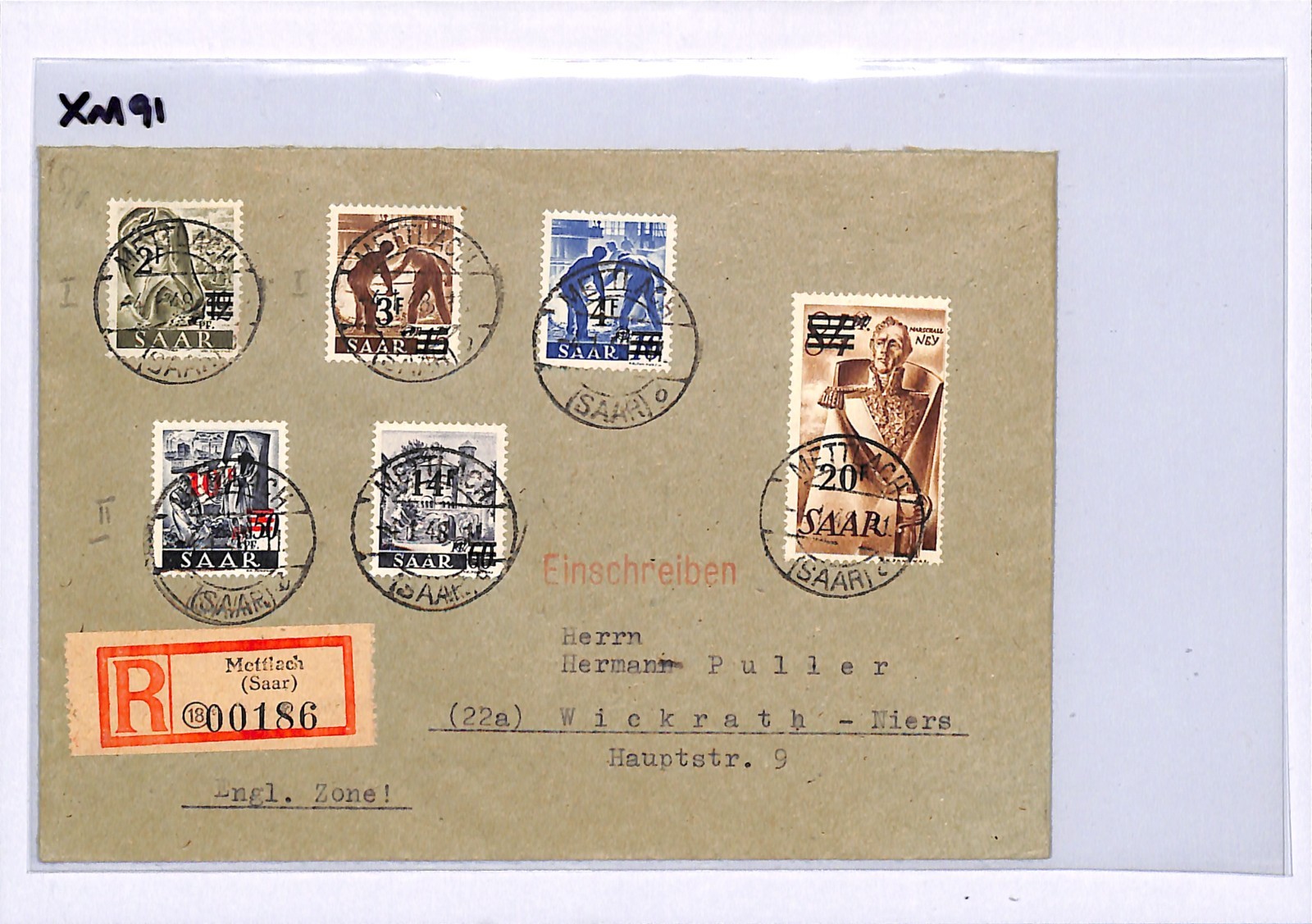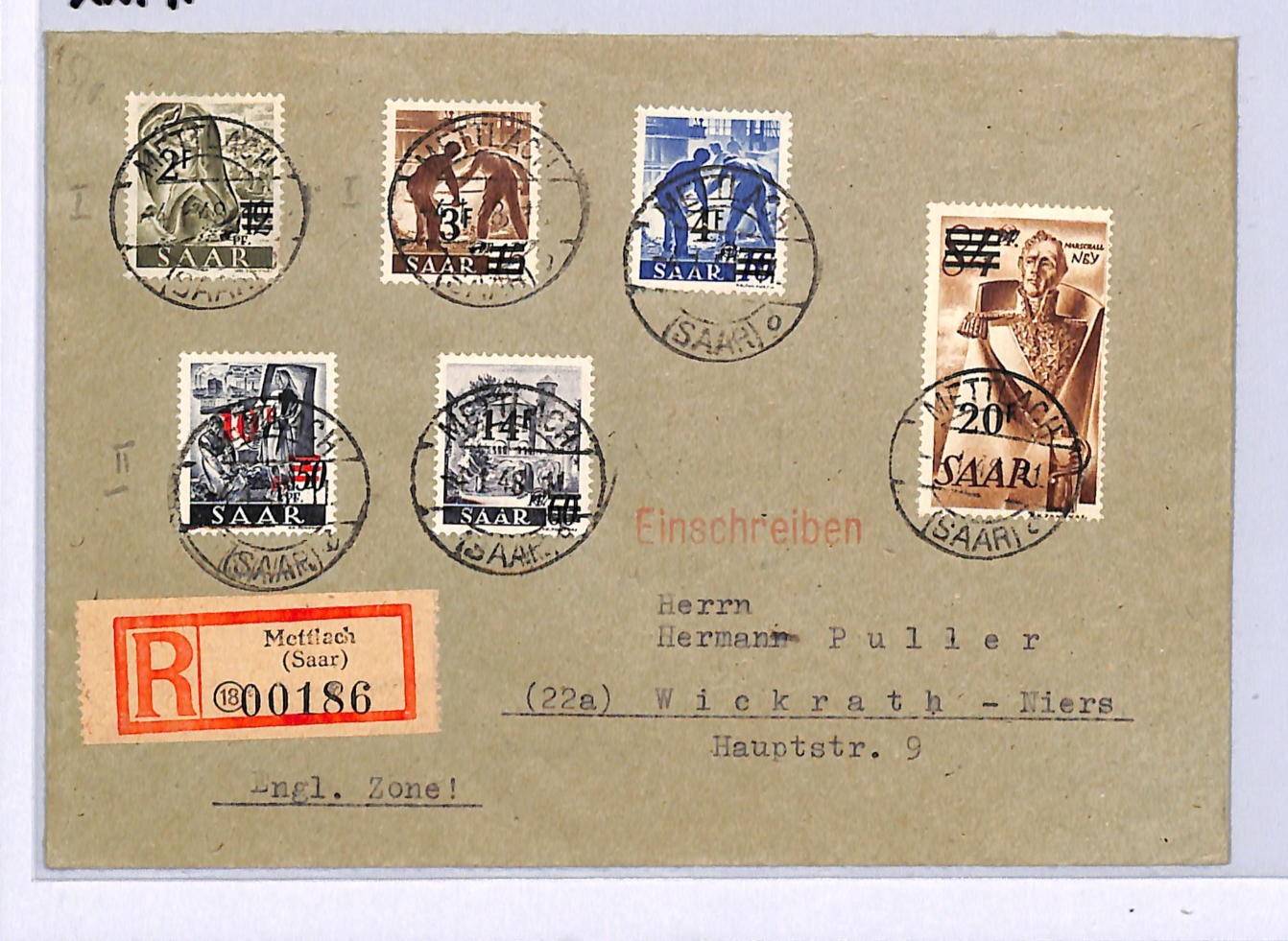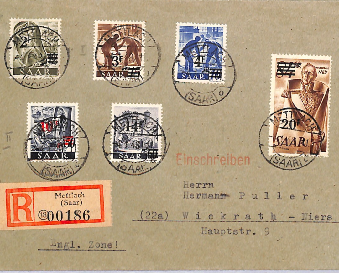 SAAR Cover 20F HIGH VALUE Surcharges Mettlach Registered Wickrath 1948 XM91