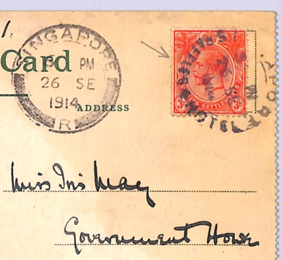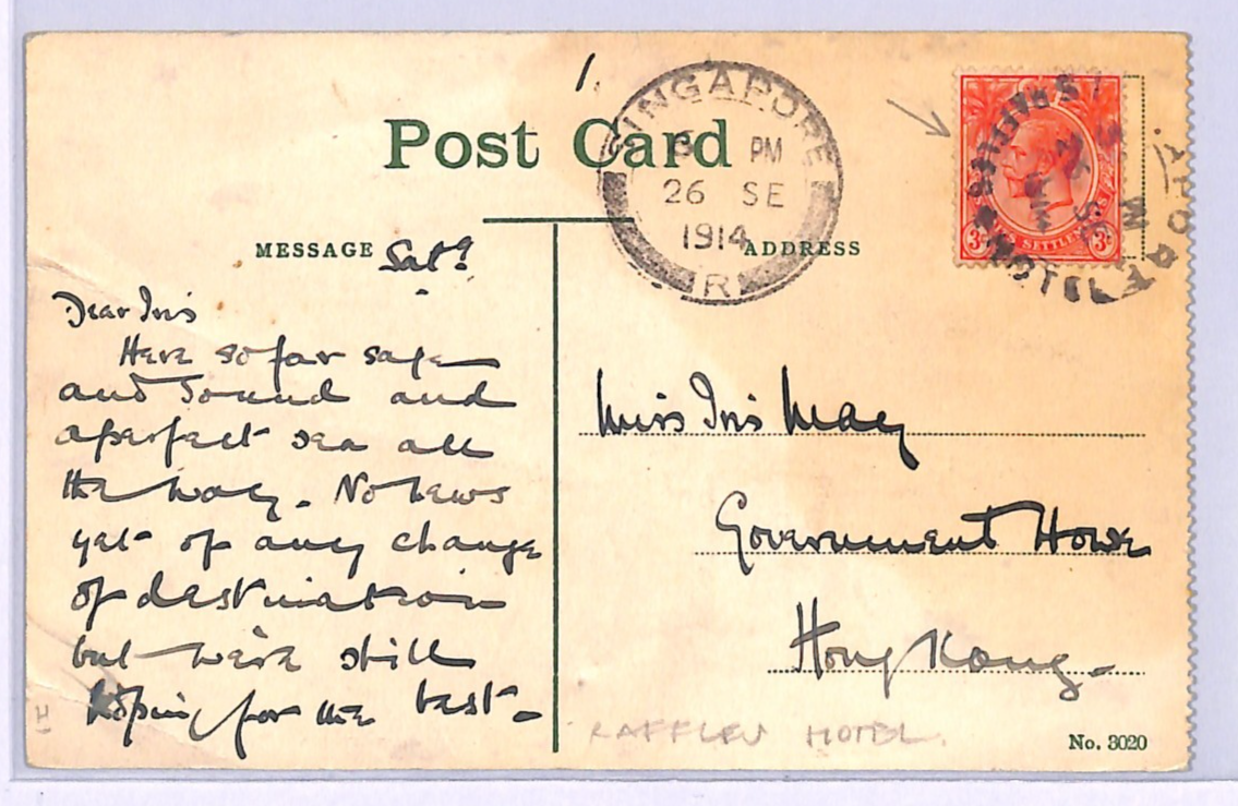 SINGAPORE Malaya Straits Postcard *RAFFLES HOTEL* CDS 1914 Hong Kong WM36
