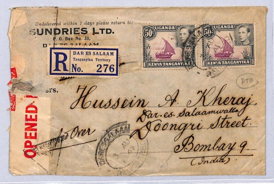 SOUTH AFRICA/KUT Overprints/TANGANYIKA Cover Dar Regd WW2 1941 INDIA Censor ZV2