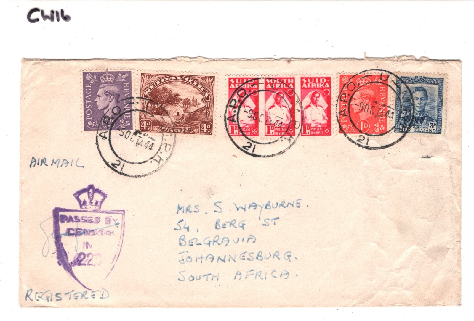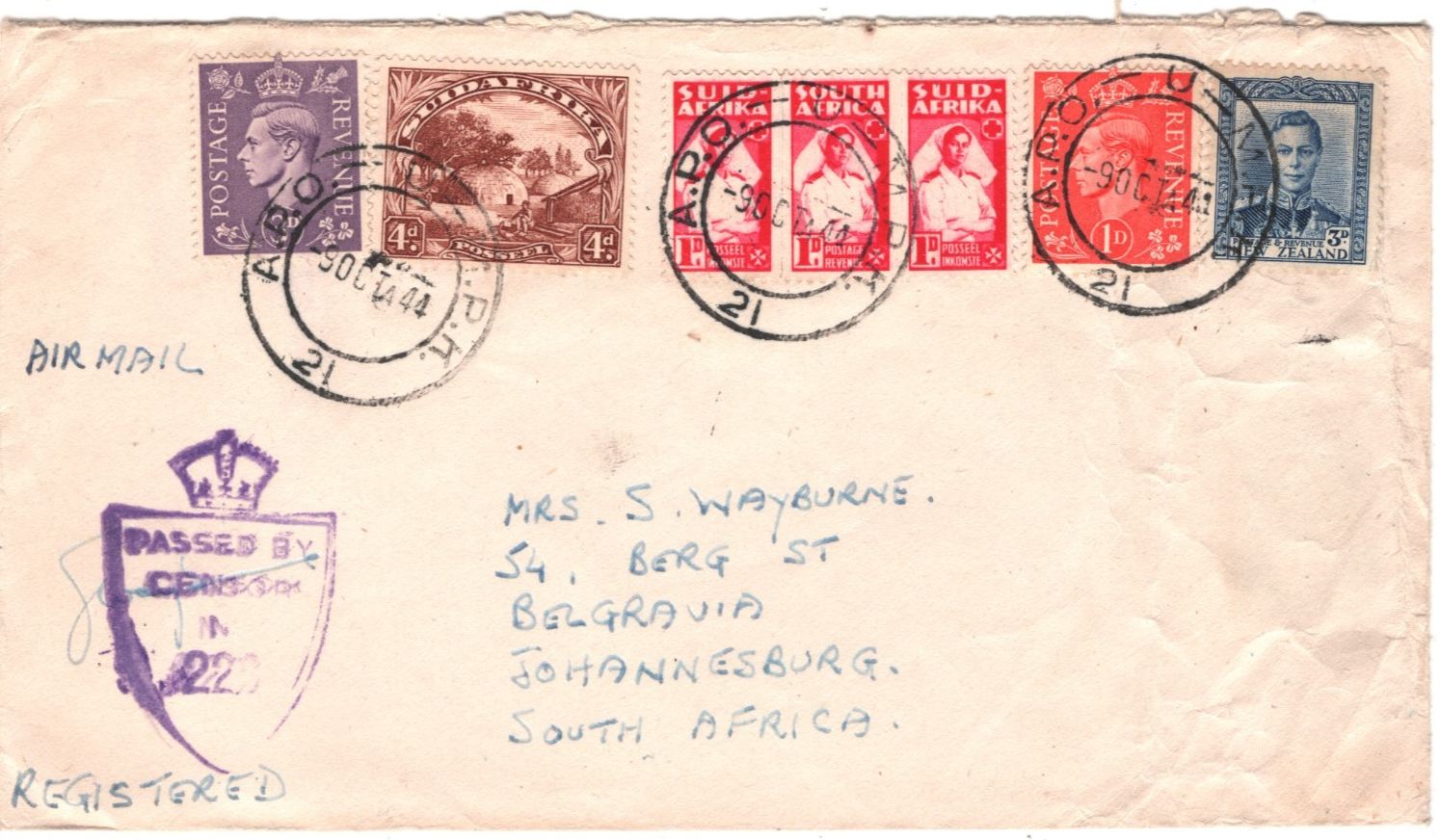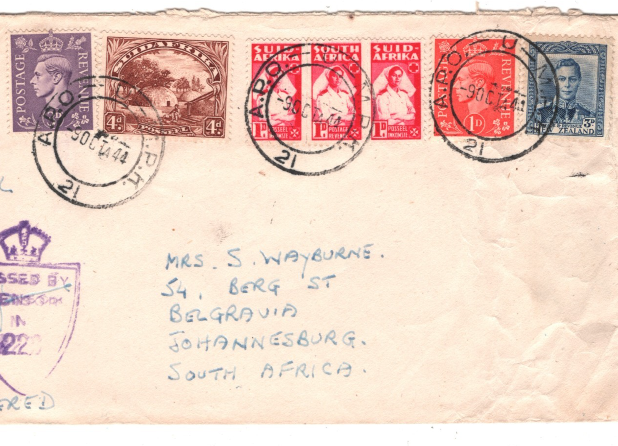 SOUTH AFRICA NEW ZEALAND GB Cover WW2 *TRIPLE MIXED FRANKING* Military 1944 CW16