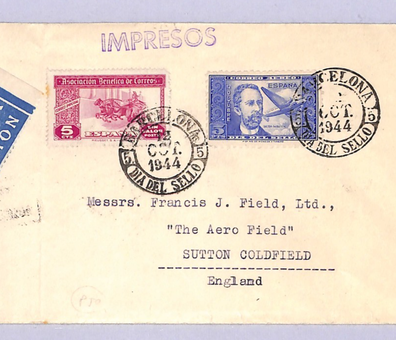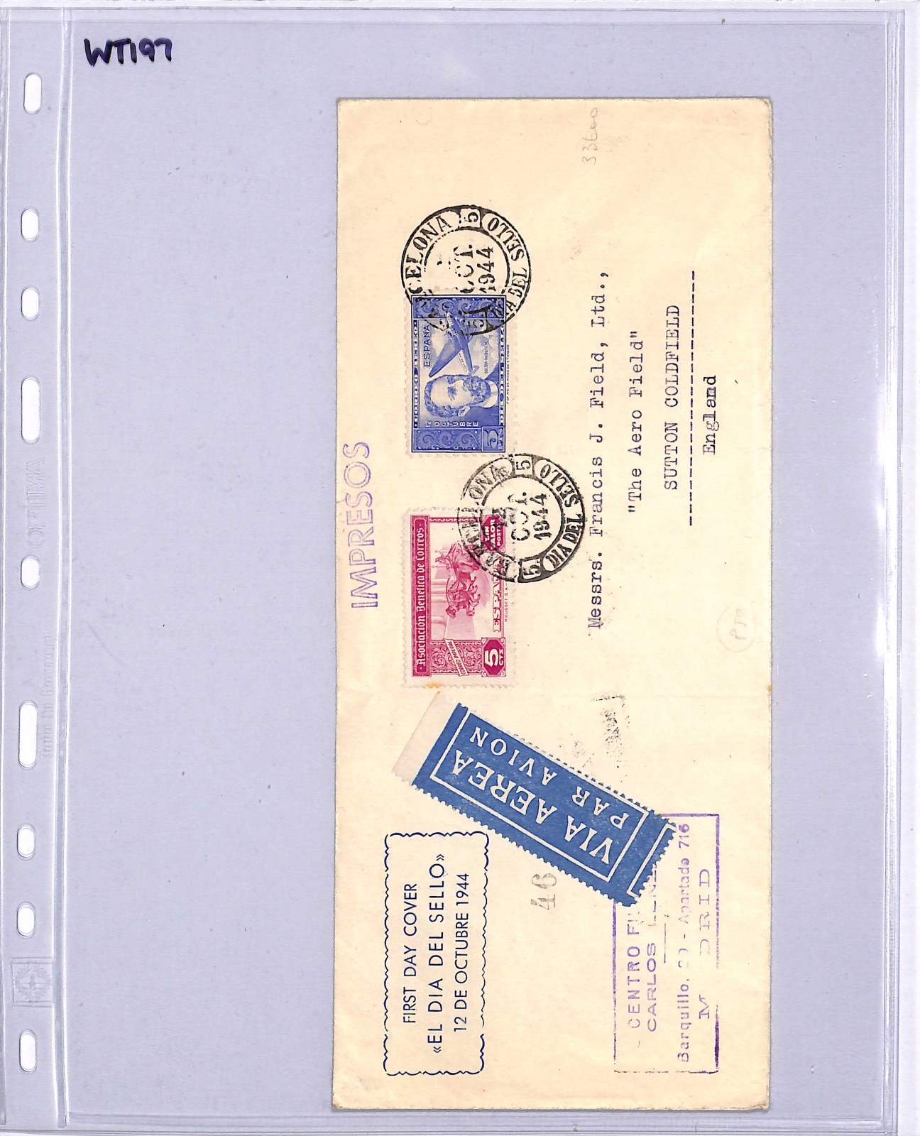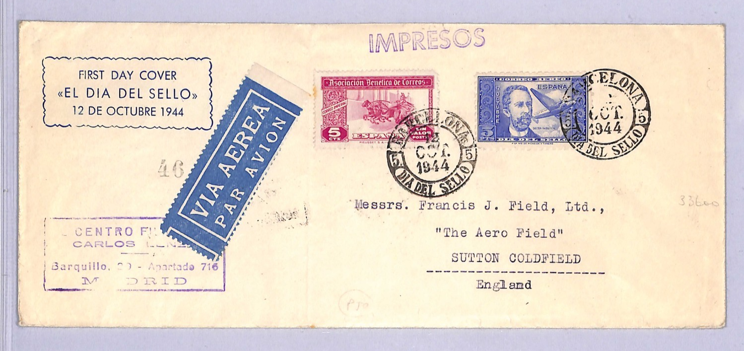 SPAIN Air Mail FDC 1944 *EL DIA DEL SELLO* Barcelona GB Sutton{Samwells}WT197