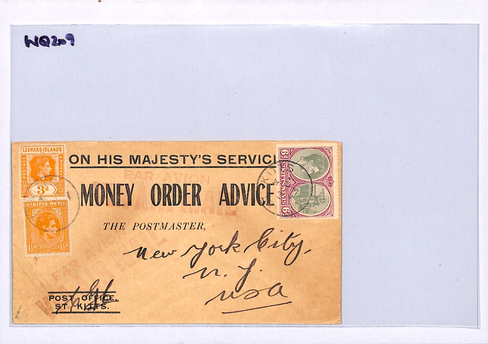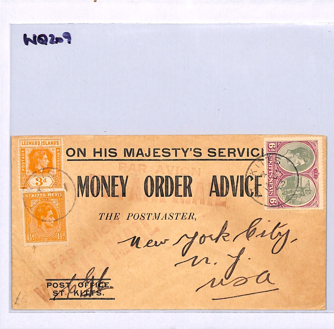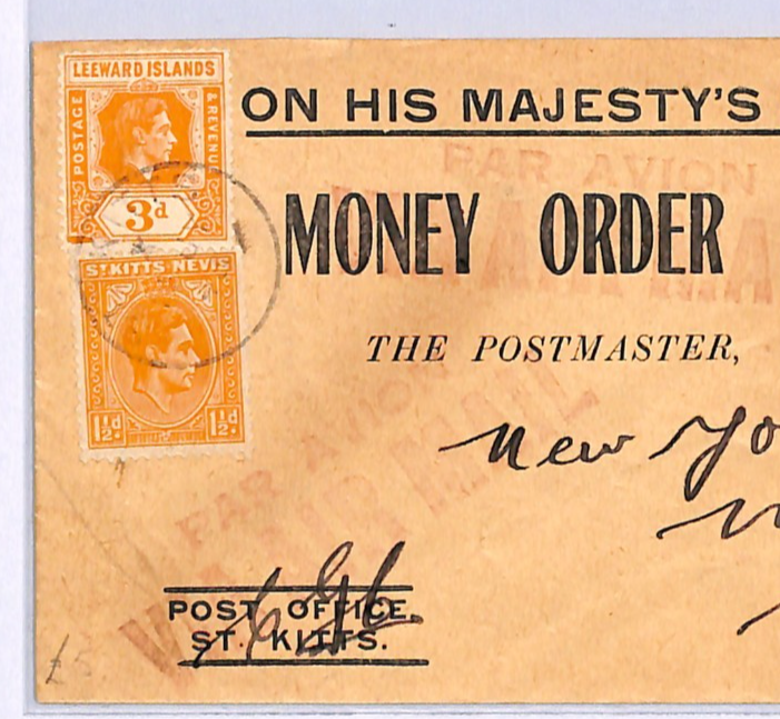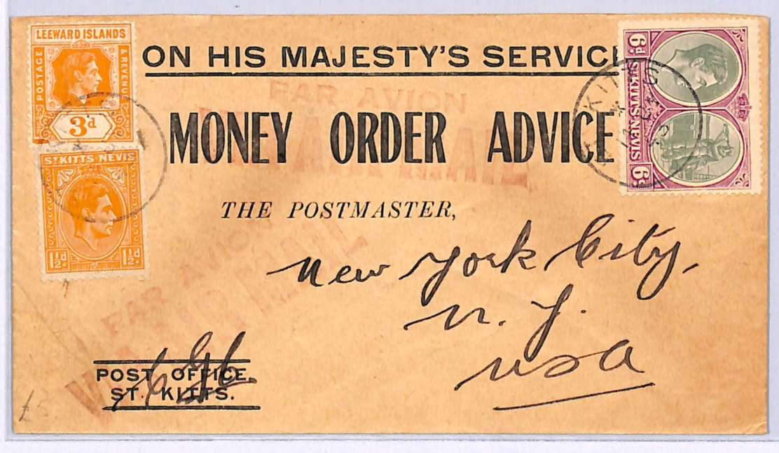 ST. KITTS BWI MONEY ORDER Cover LEEWARD ISLANDS KGVI *MIXED FRANKING* 1943 WQ209