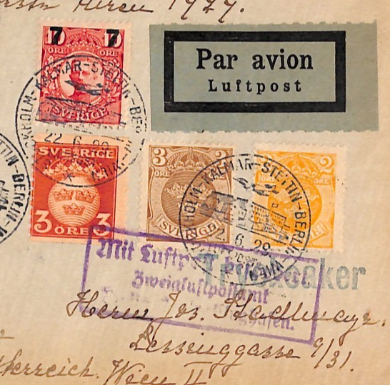 SWEDEN Air Mail Cover FIRST FLIGHT 1929 AUSTRIA Vienna via Stettin Kalmar WT67