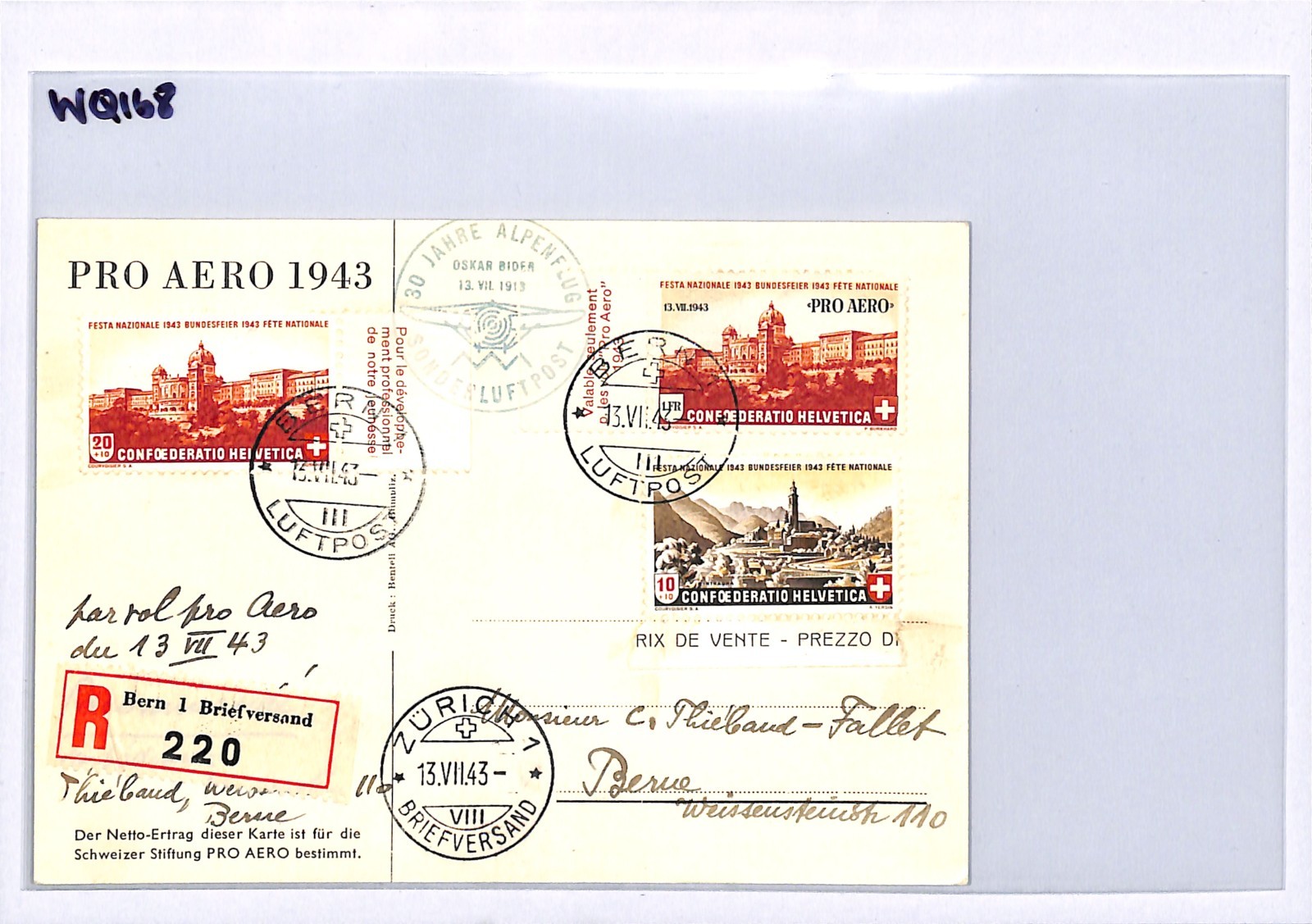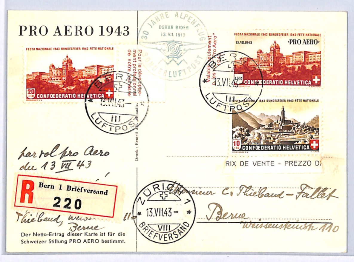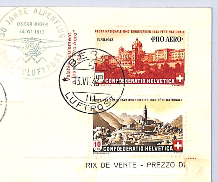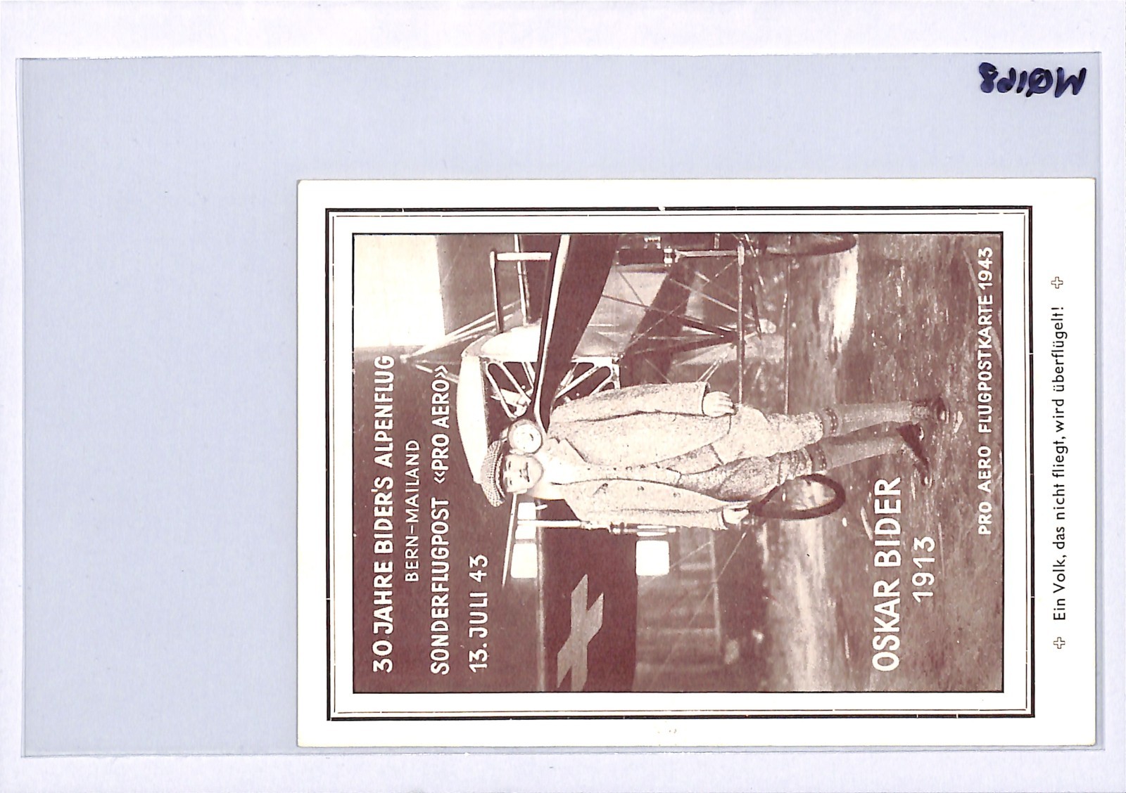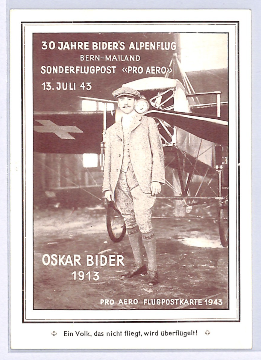 SWITZERLAND Air Mail 1943 1F *PRO AERO* Postcard BIDER ALPINE FLIGHT (1913)WQ168