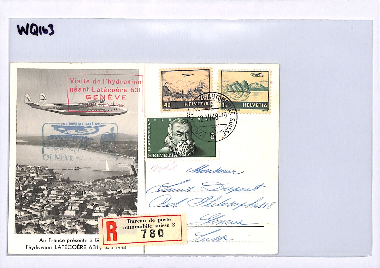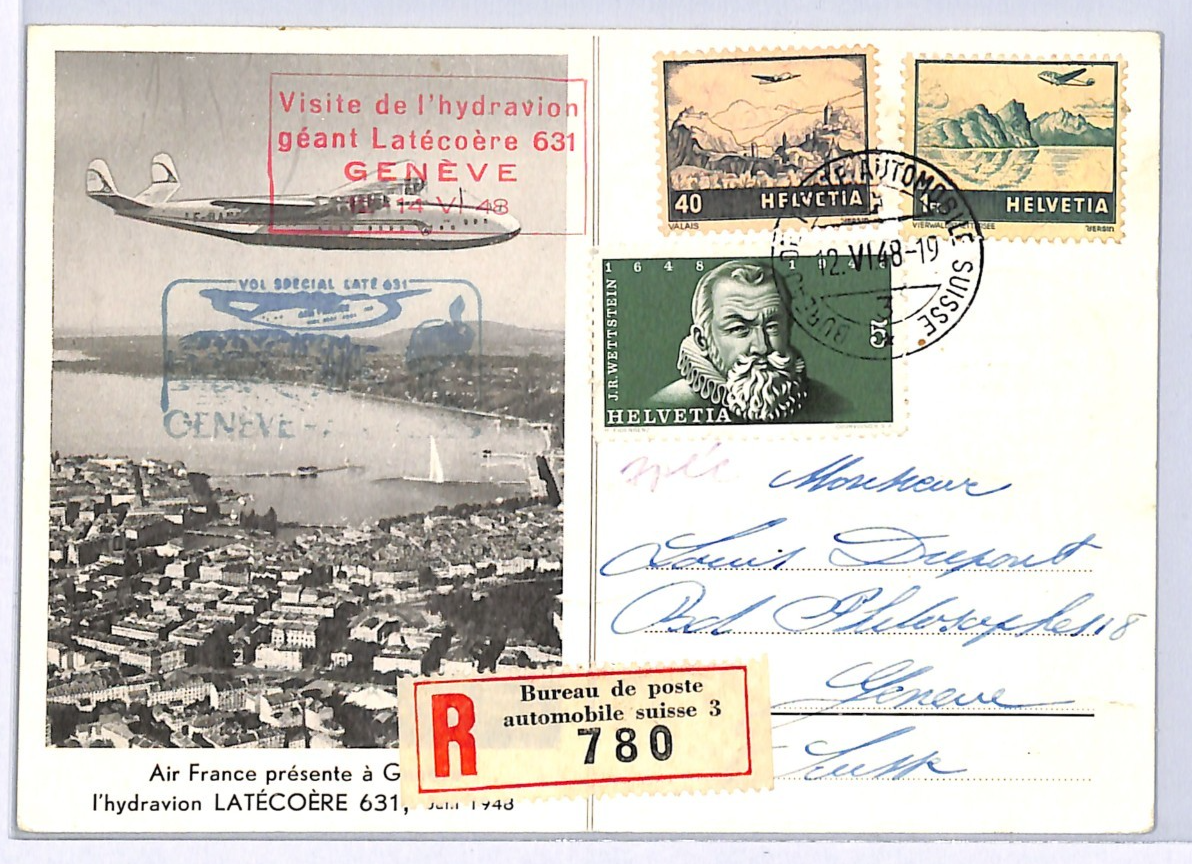 SWITZERLAND Air Mail Card AIR FRANCE *LATECOERE 631* FLYING BOAT Geneva Automobile TPO 1948 WQ163