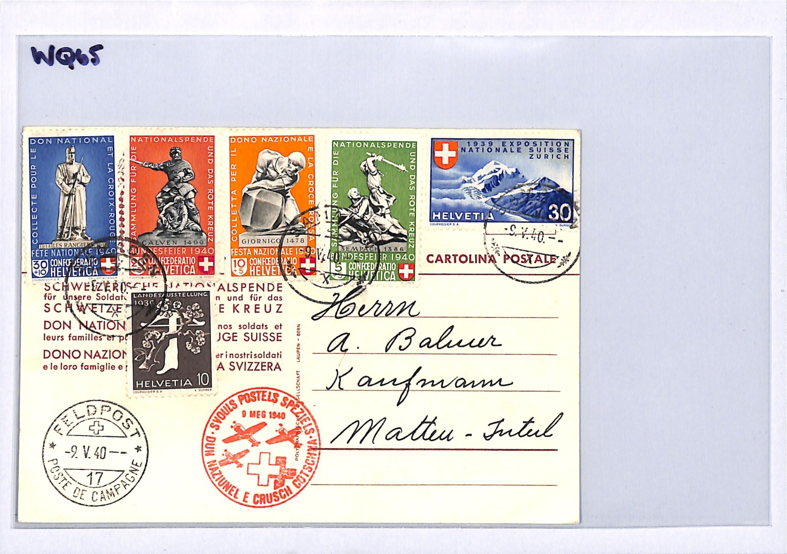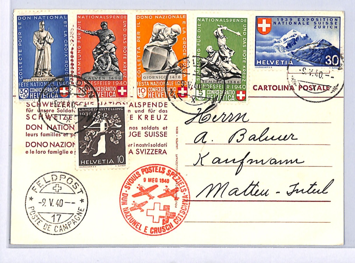 SWITZERLAND Air Mail Card Military Feldpost RED CROSS SPECIAL FLIGHT BUNDESFEIER 1940 WQ65