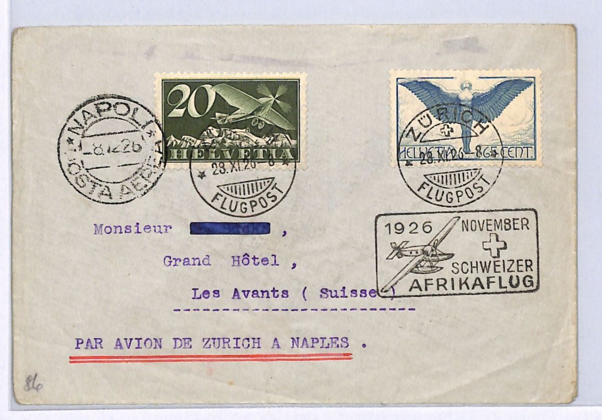 SWITZERLAND Air Mail Cover 1926 AFRIKAFLUG Zurich Naples Retour WQ104