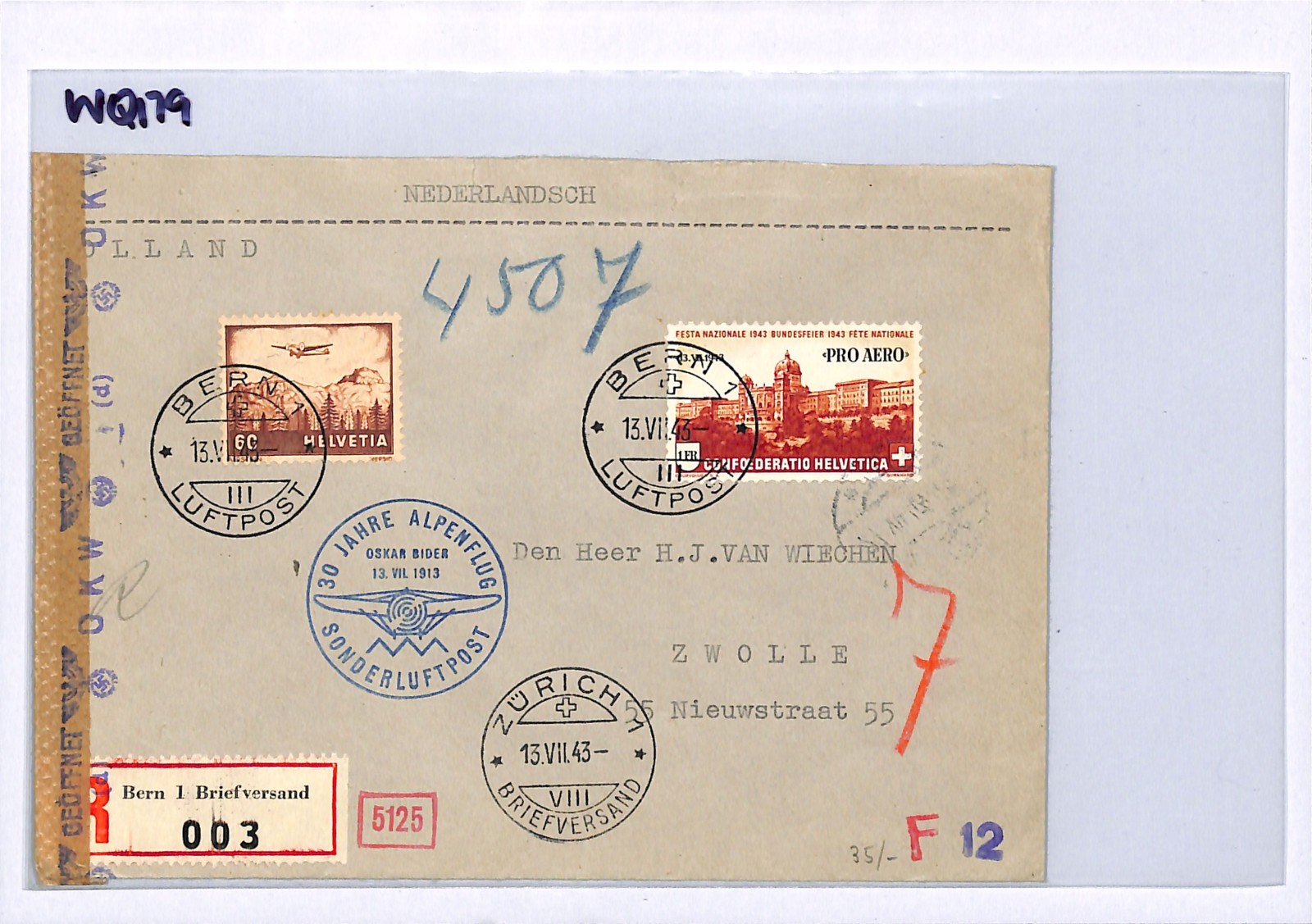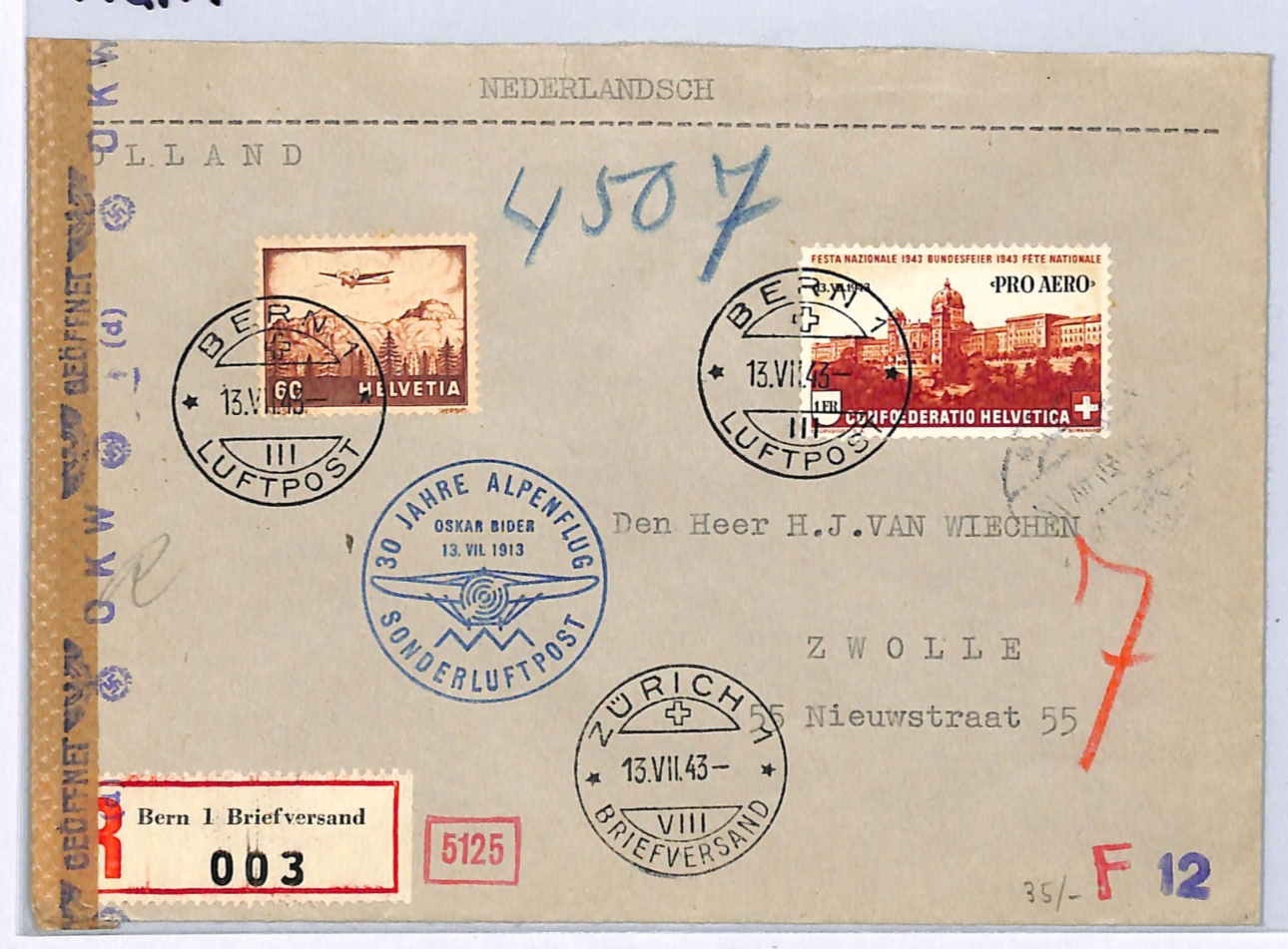 SWITZERLAND Air Mail Cover BIDER ALPINE FLIGHT ANNIVERSARY Zurich NETHERLANDS Zwolle GERMAN OKW CENSOR WW2 1943 WQ179