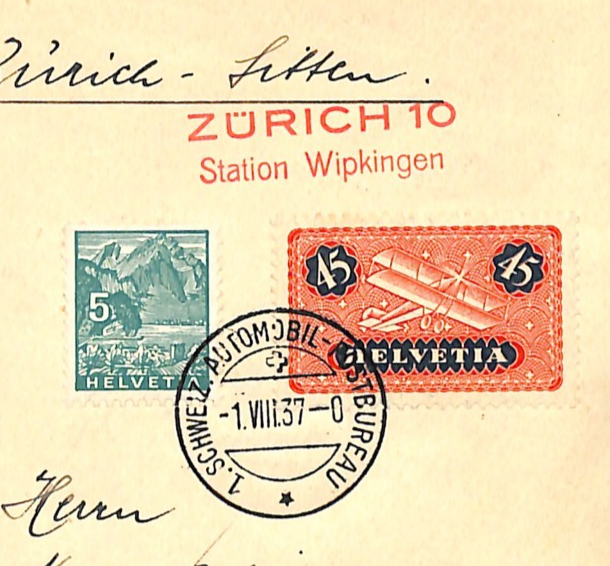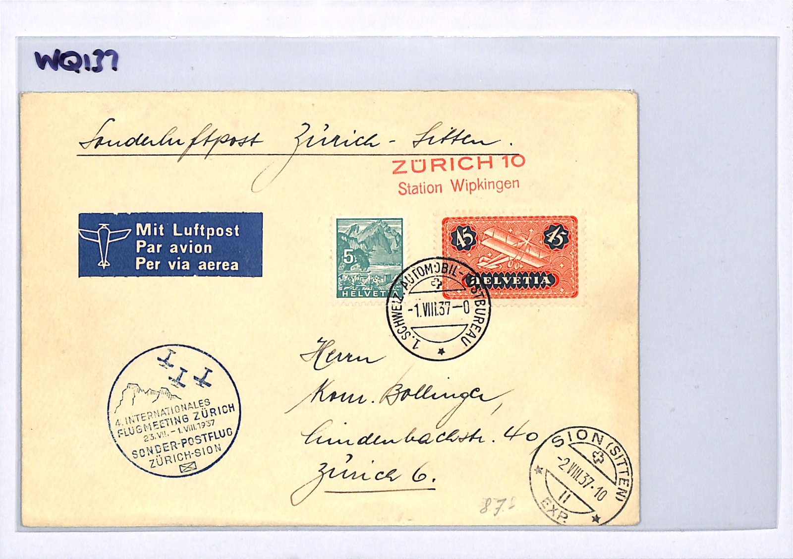 SWITZERLAND Air Mail Cover FLUGMEETING SPECIAL FLIGHT Zurich-Sion 1937 AUTOMOBILPOST BUREAU TPO WQ137