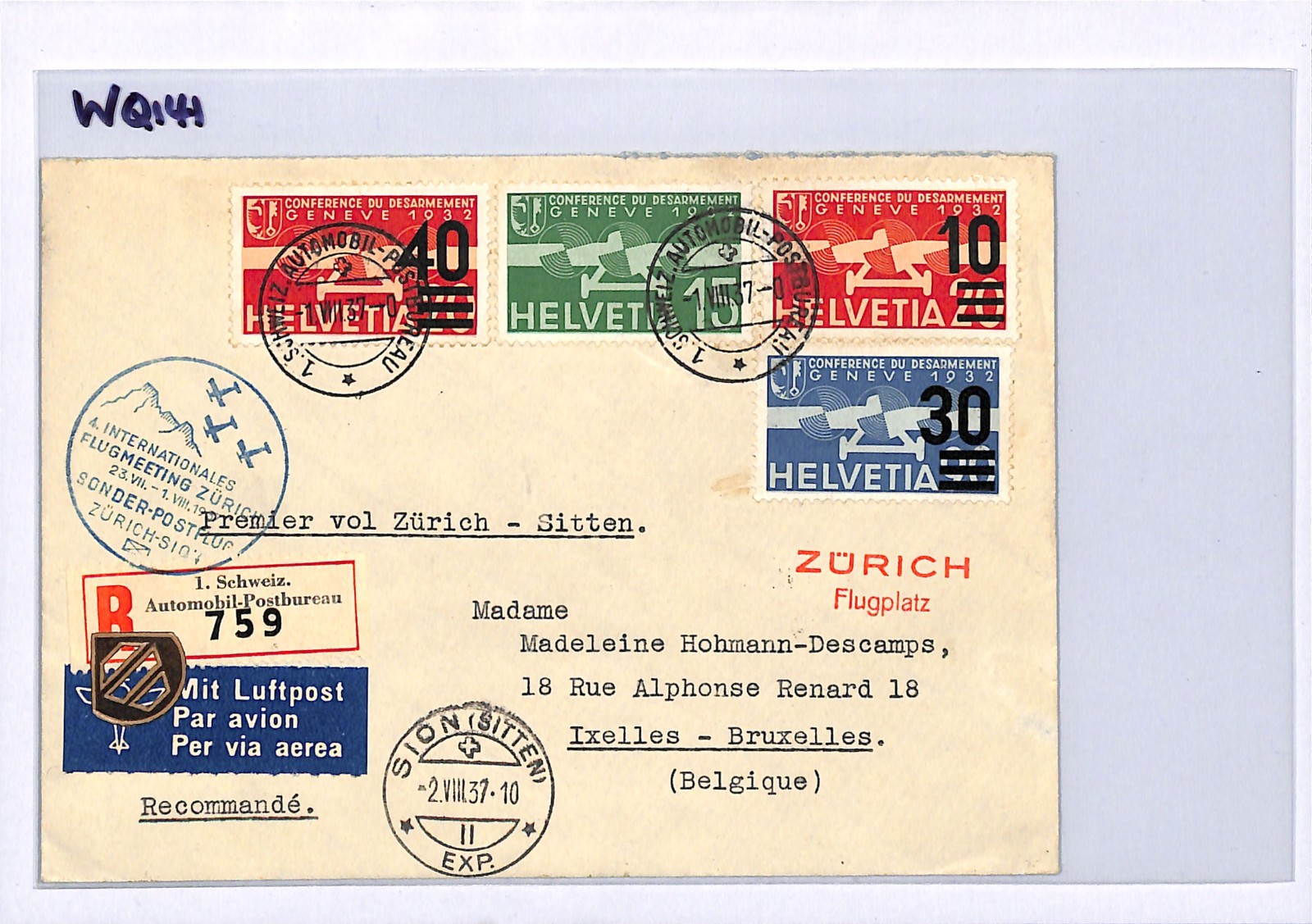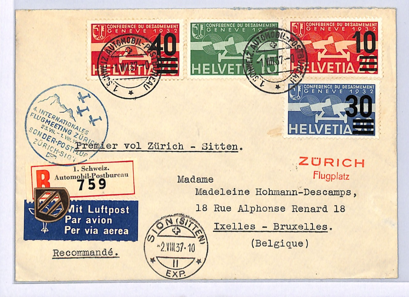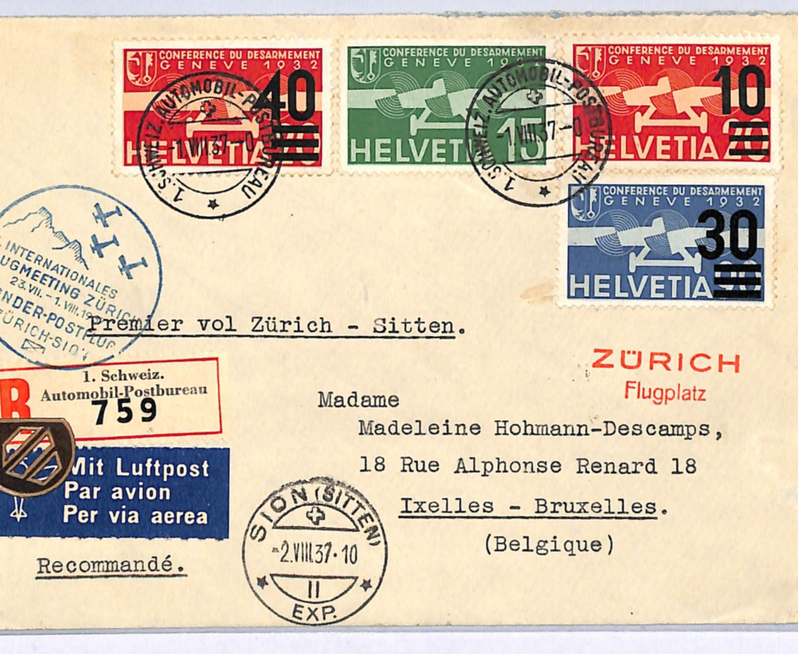 SWITZERLAND Air Mail Cover FLUGMEETING SPECIAL FLIGHT Zurich-Sion *Automobil Postbureau* Registered TPO Belgium Ixelles 1937 WQ141