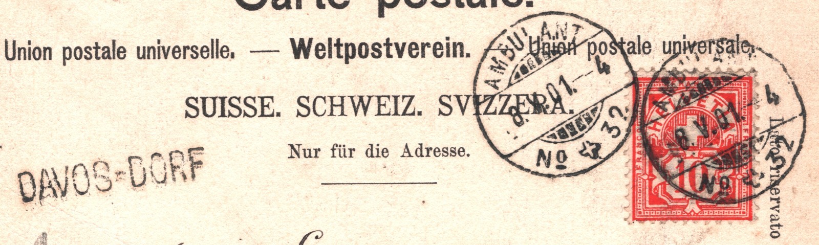 SWITZERLAND MOUNTAIN RAILWAY Card *DAVOS-DORF* STATION Postmark TPO 1901 XV199