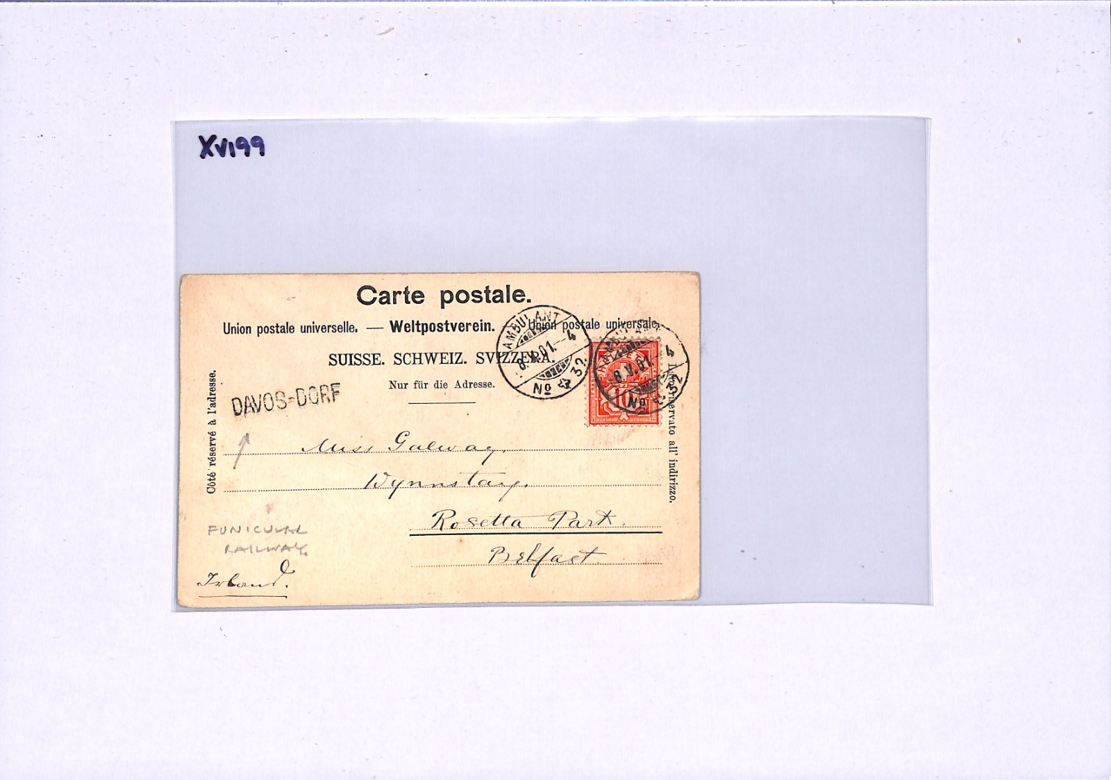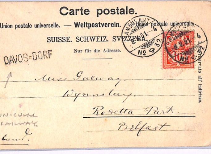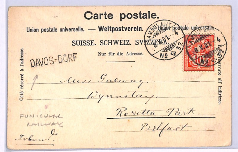 SWITZERLAND FUNICULAR MOUNTAIN RAILWAY TPO *AMBULANT 32* CDS Card Davos Belfast Ireland 1901 XV199