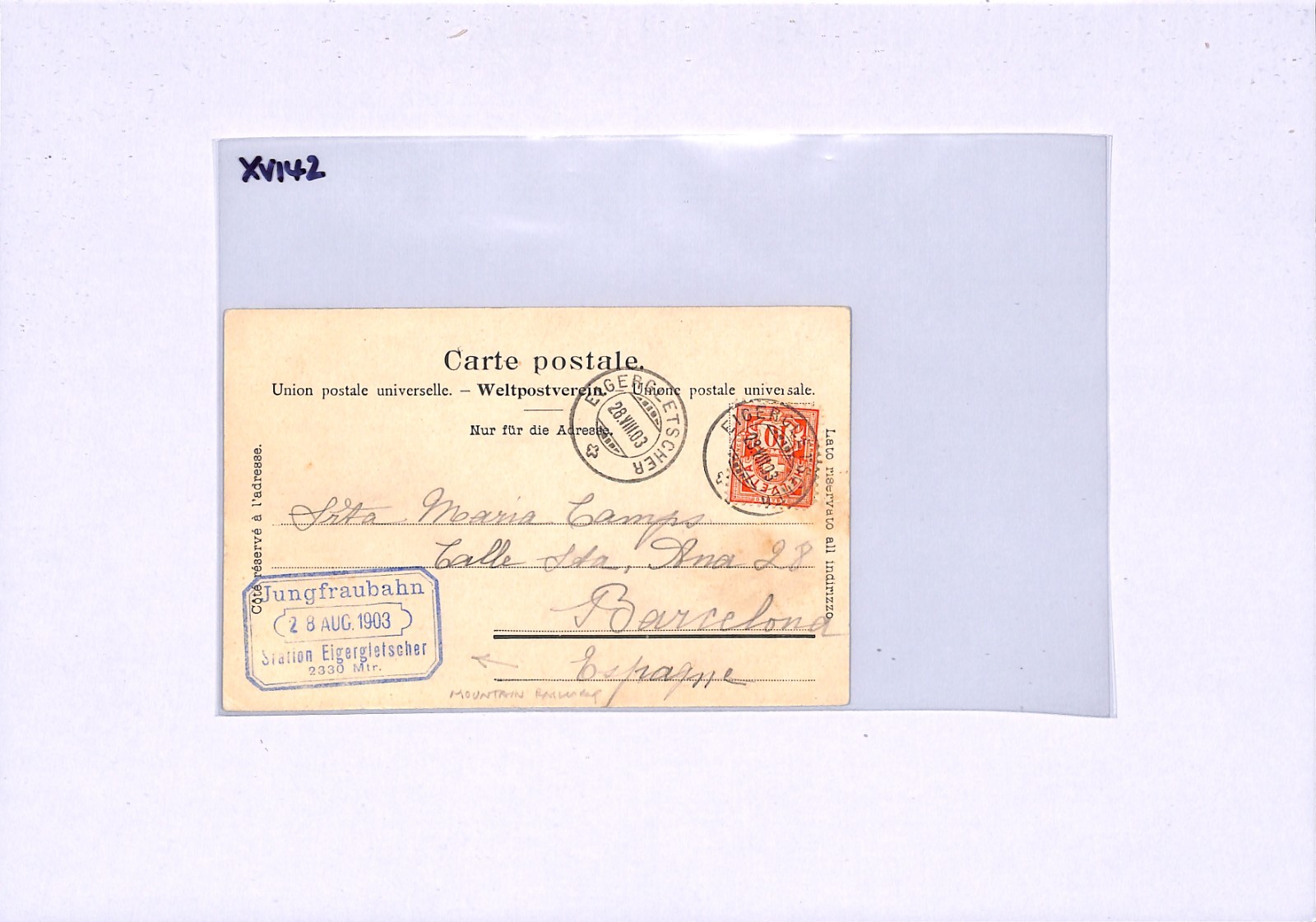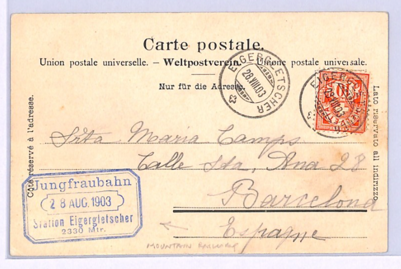 SWITZERLAND Mountain Railway Card JUNGFRAUBAHN Eigergletscher Spain Barcelona 1903 XV142