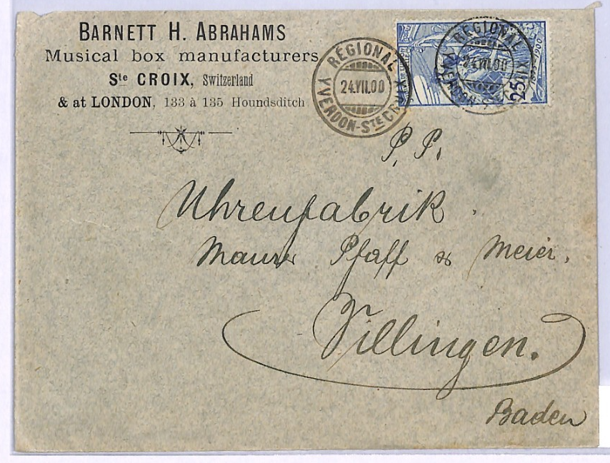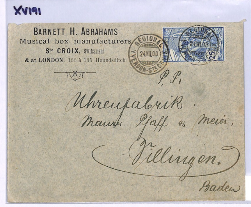 SWITZERLAND RAILWAY Cover *MUSIC BOX* Advert YVERDON-Ste CROIX 1900 TPO XV191