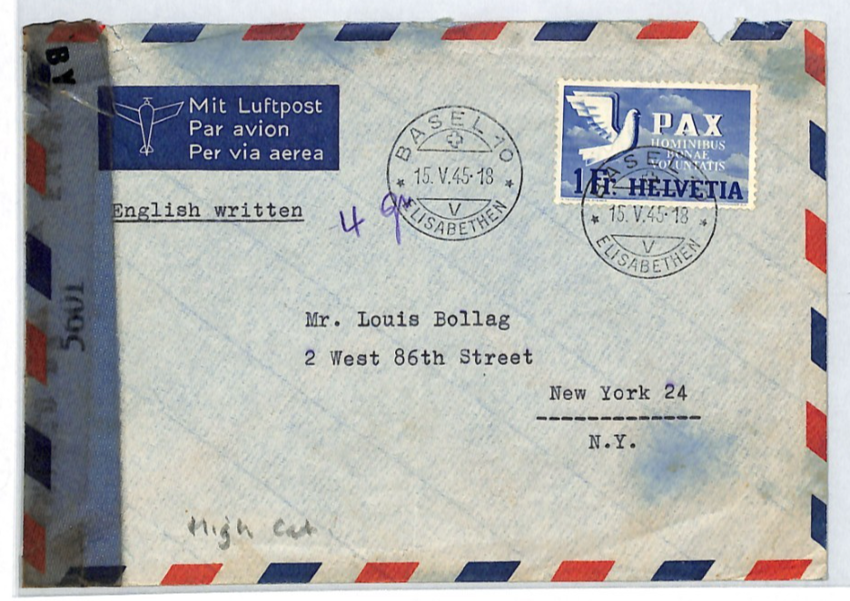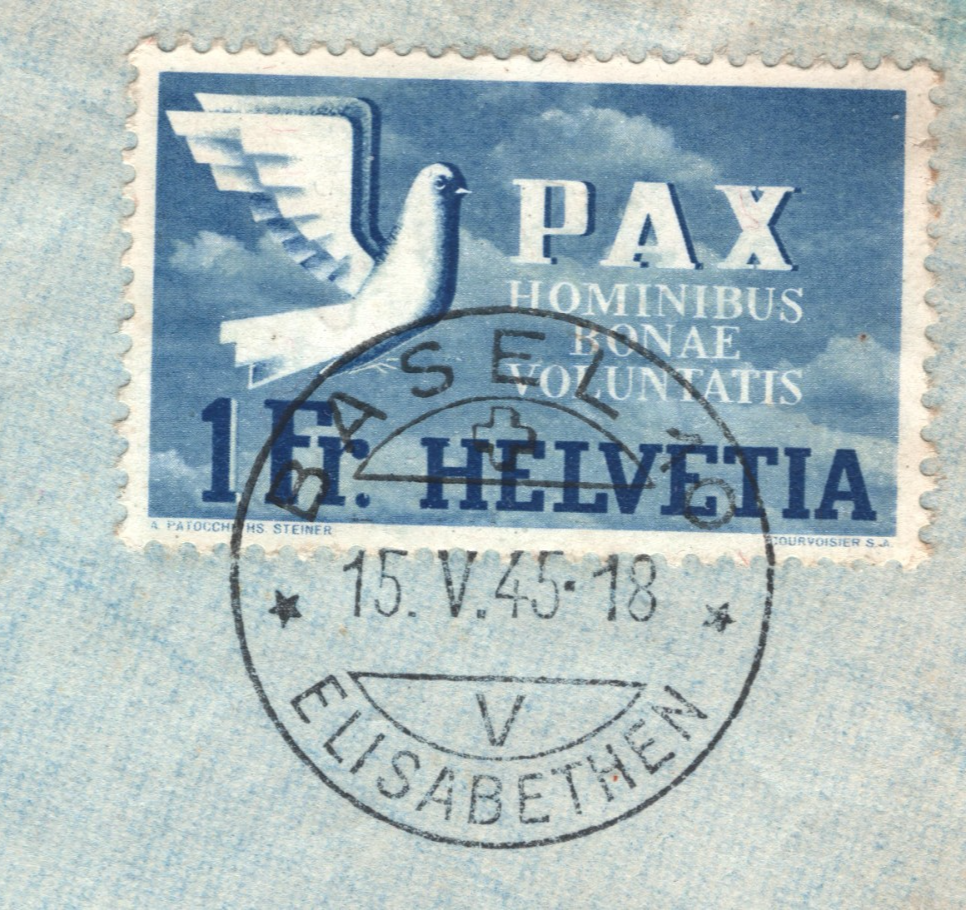 SWITZERLAND WW2 Censor Cover 1Fr *PAX* PEACE HIGH VALUE Basel 1945 Air USA XT233