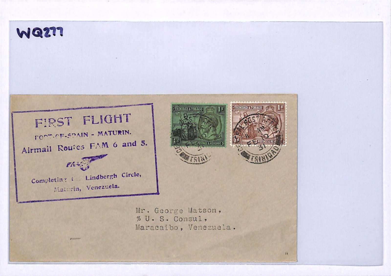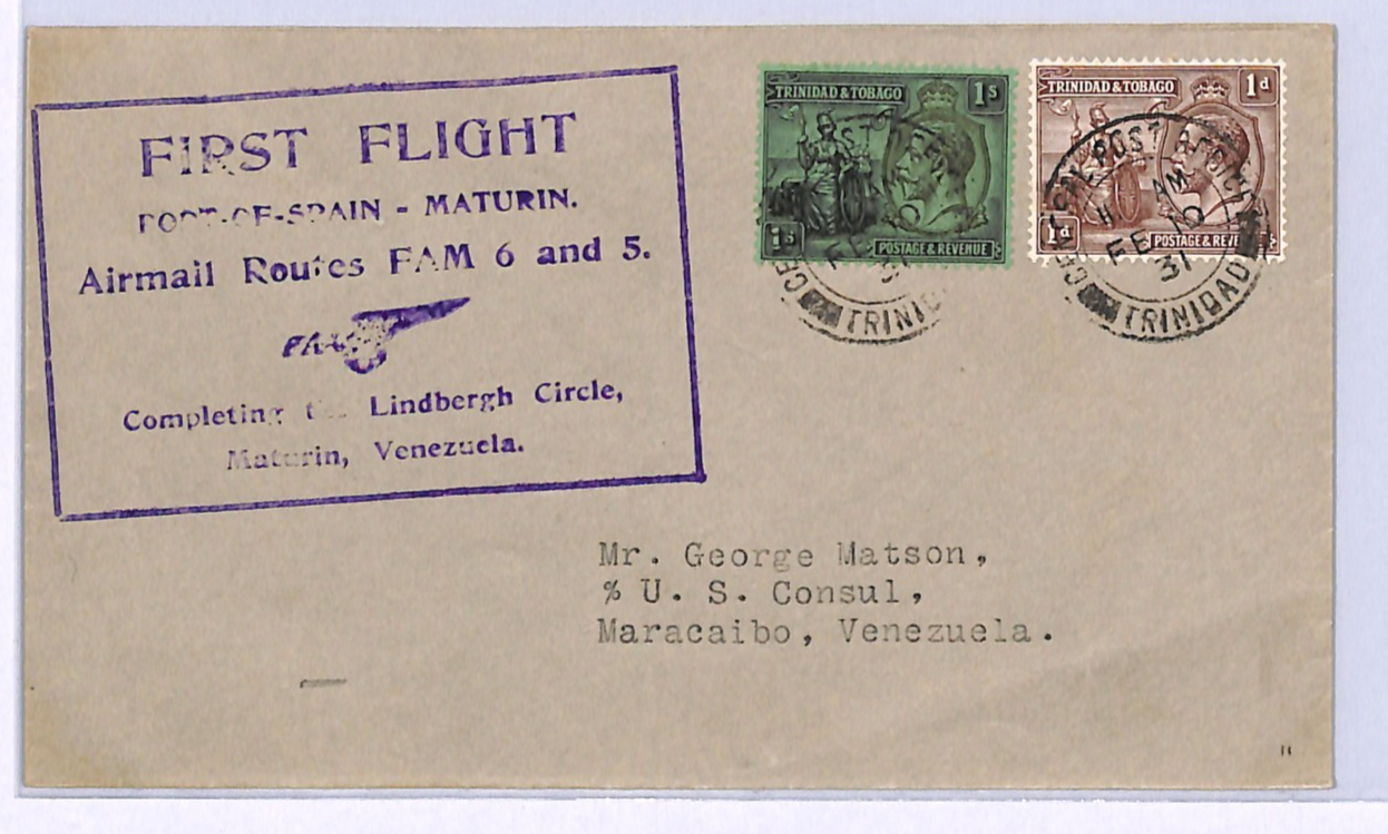 TRINIDAD AND TOBAGO Air Mail Cover PAA FIRST FLIGHT VENEZUELA US Consul Maracaibo 1931 WQ277