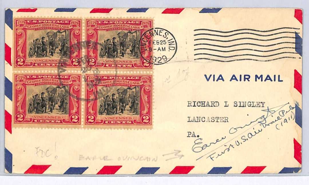 REMARKABLE FIRST DAY COVER combining multiple desirable elements. RELEVANT *VINCENNES INDIANA* Machine Cancel on GEORGE ROGERS CLARK 2c SURRENDER OF FORT SACKVILLE Commemorative new issue in BLOCK OF FOUR. Note also signed by EARLE OVINGTON (Pioneer US Pilot). Fine for an item of this type & period. Please look at all the scans to help form your own opinion (WAF).