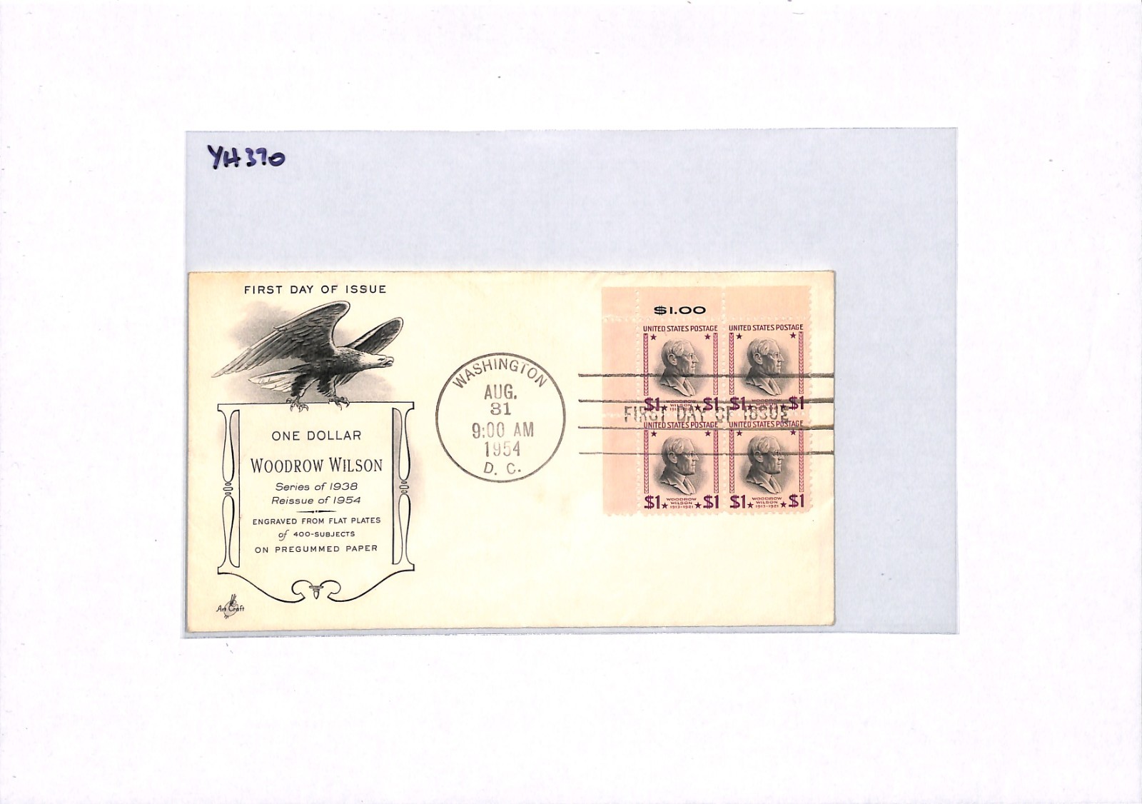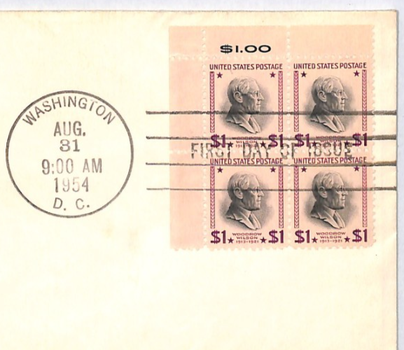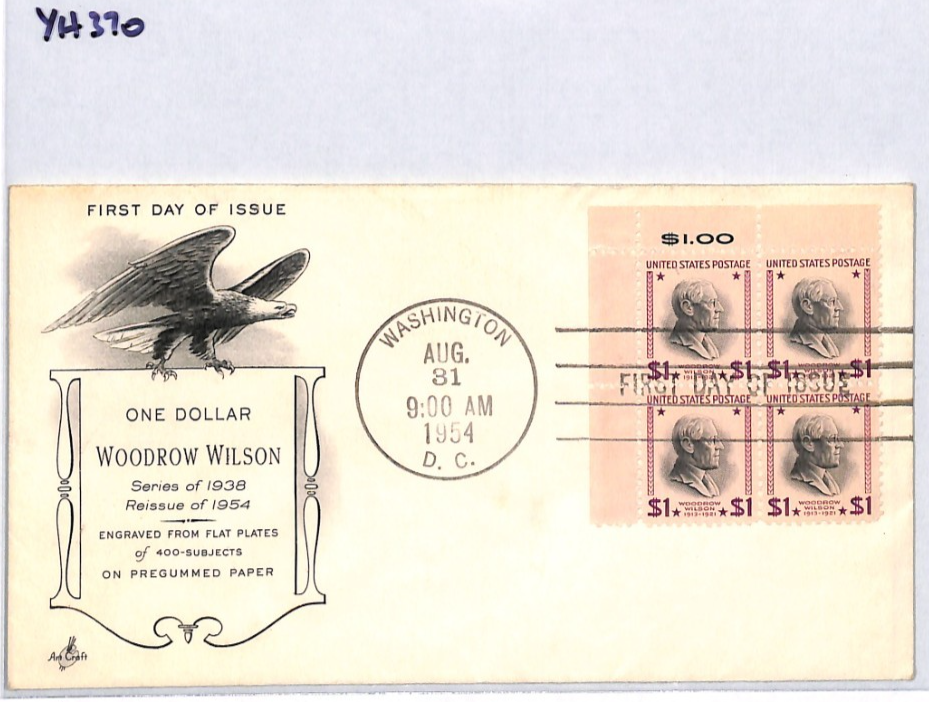 USA 1954 FDC *Woodrow Wilson* $1 Dollar High Value Block{4} ILLUSTRATED Eagle CACHET First Day Cover YH370