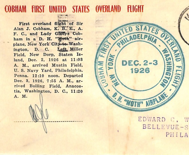 USA Air 1926 Cover *ALAN COBHAM* Signed FIRST FLIGHT Milburn Philadelphia WX255