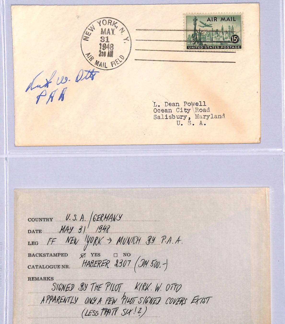USA Air 1948 Cover FIRST FLIGHT MUNICH NY Field Salisbury MD Signed PILOT WT130