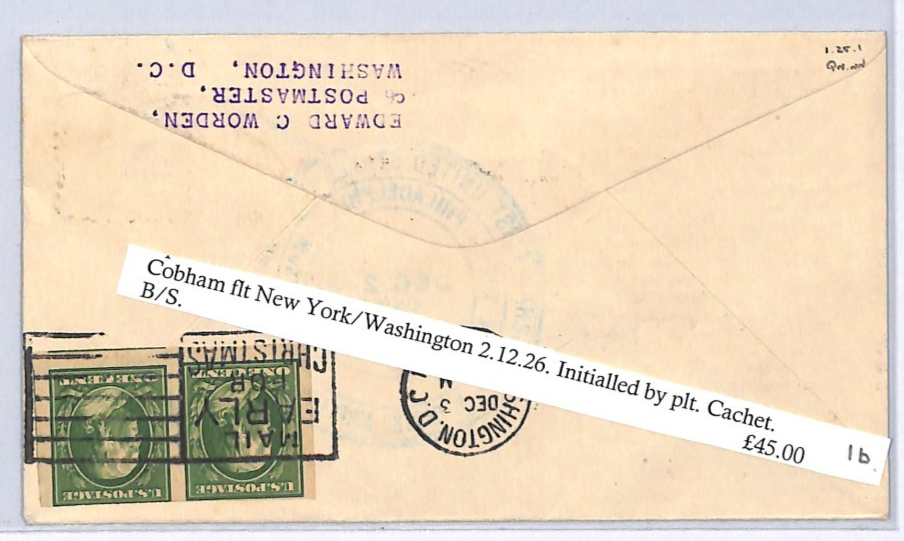 USA Air Mail Card 1926 *COBHAM* Signed FIRST FLIGHT New York Washington DC WZ202