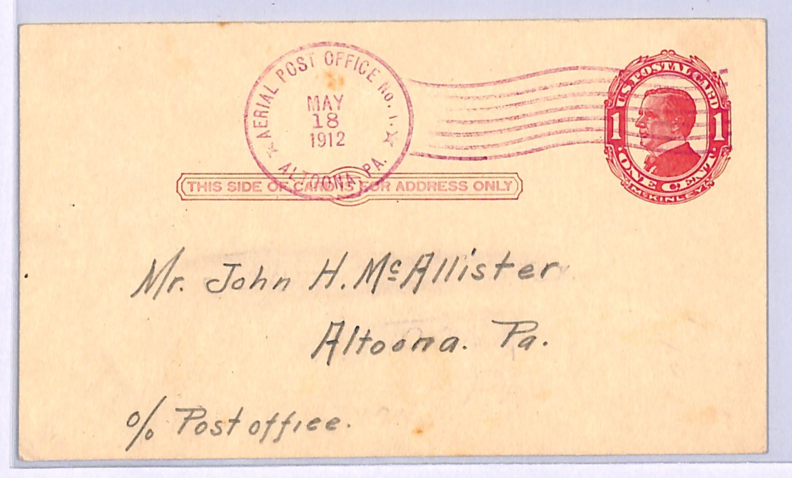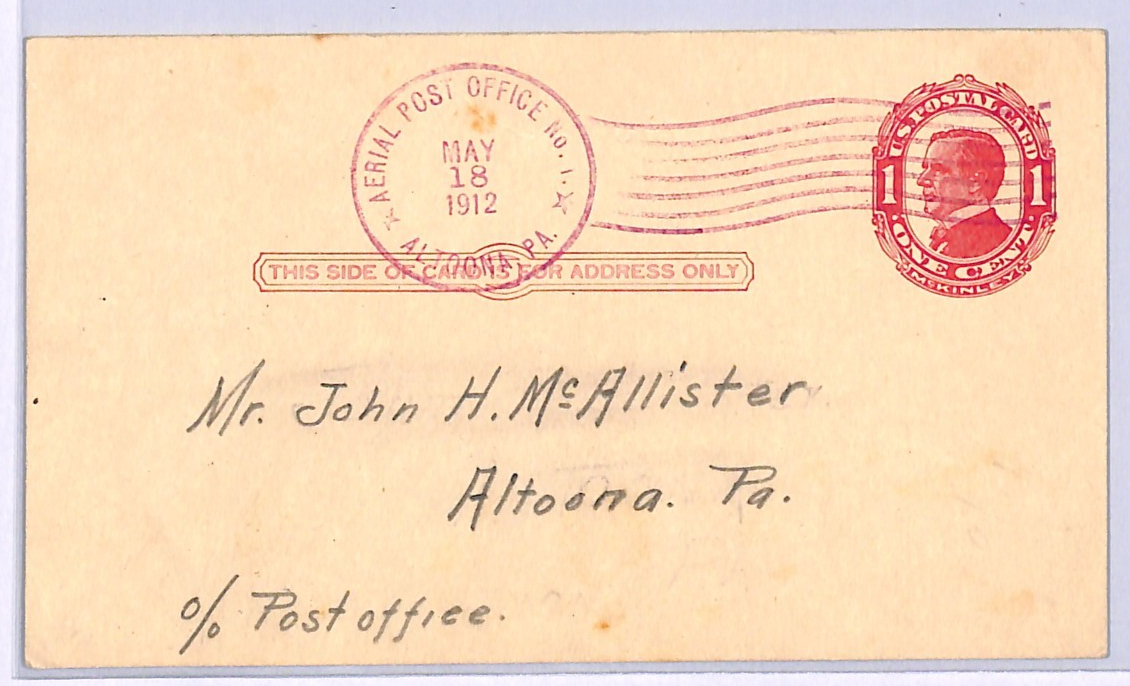 USA Air Mail 1912 Altoona PA *AERIAL POST OFFICE No1* Stationery Card 1c WD348