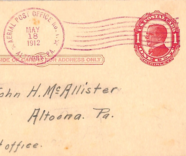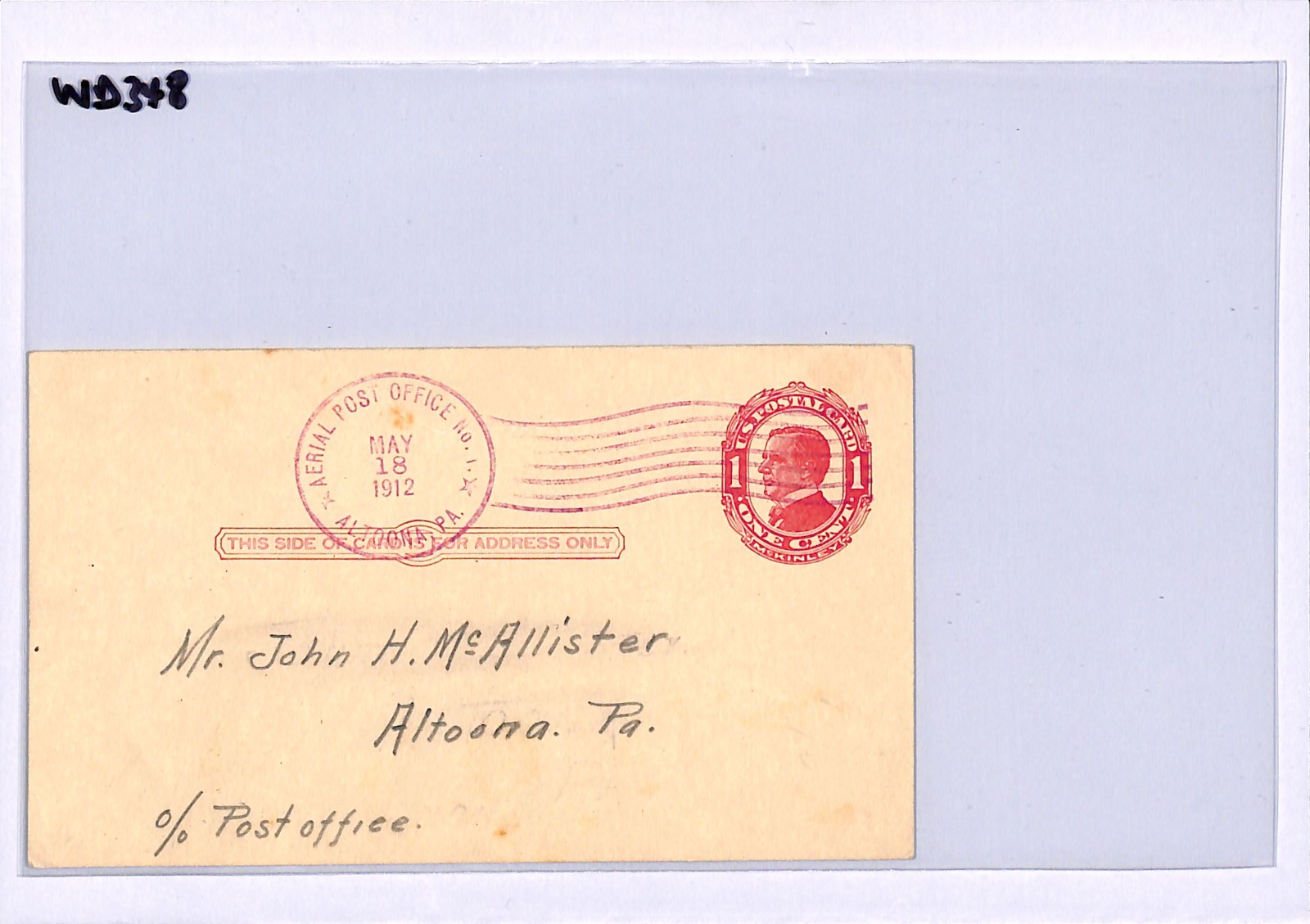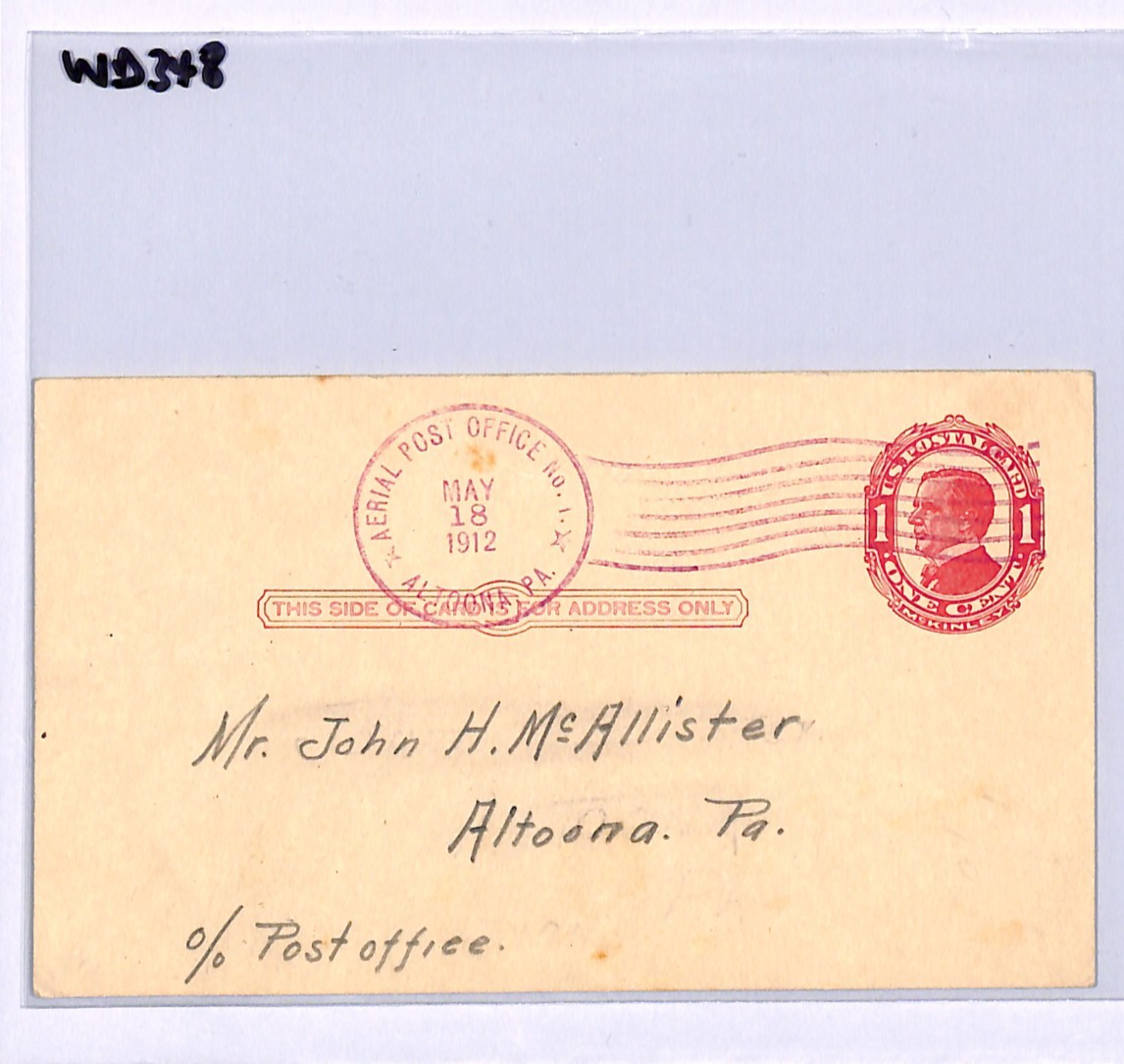 USA Air Mail May 1912 Card *AERIAL POST OFFICE No.1* Altoona Red Machine WD348
