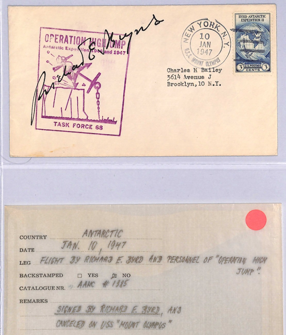 USA ANTARCTIC EXPEDITION Cover *RICHARD E BYRD* SIGNED 1947 USS Mount Olympus New York OPERATION HIGH JUMP WT131