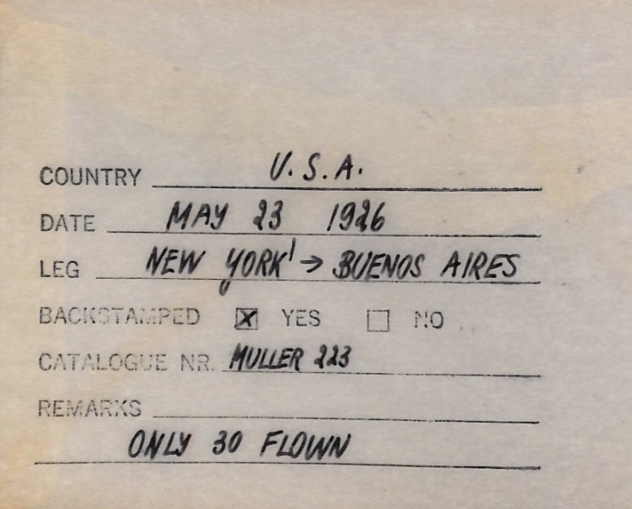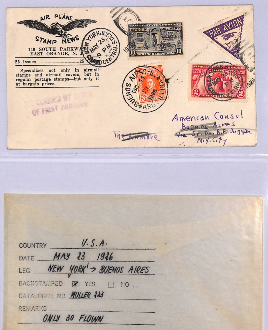 USA-ARGENTINA Air 1926 Cover *DON DUGGAN* Pilot FIRST FLIGHT Muller #223 (15,000 pts) WT139