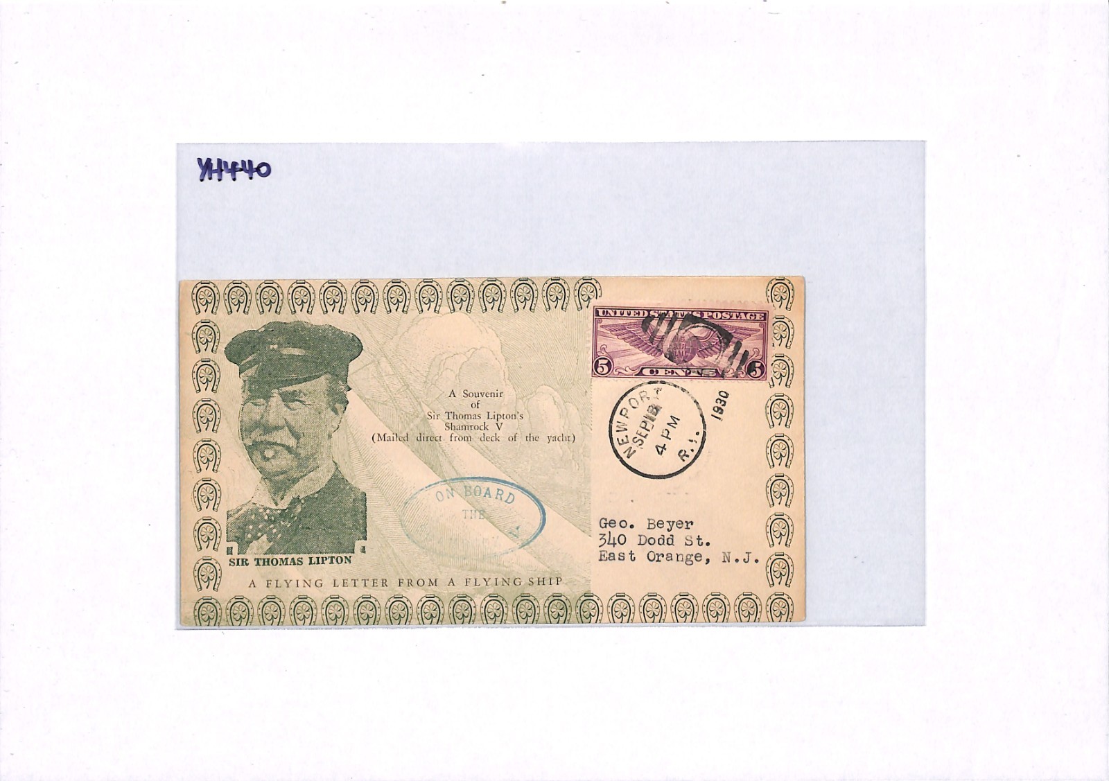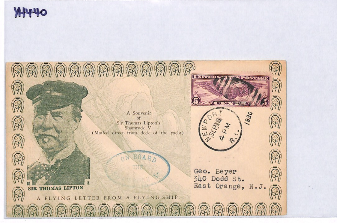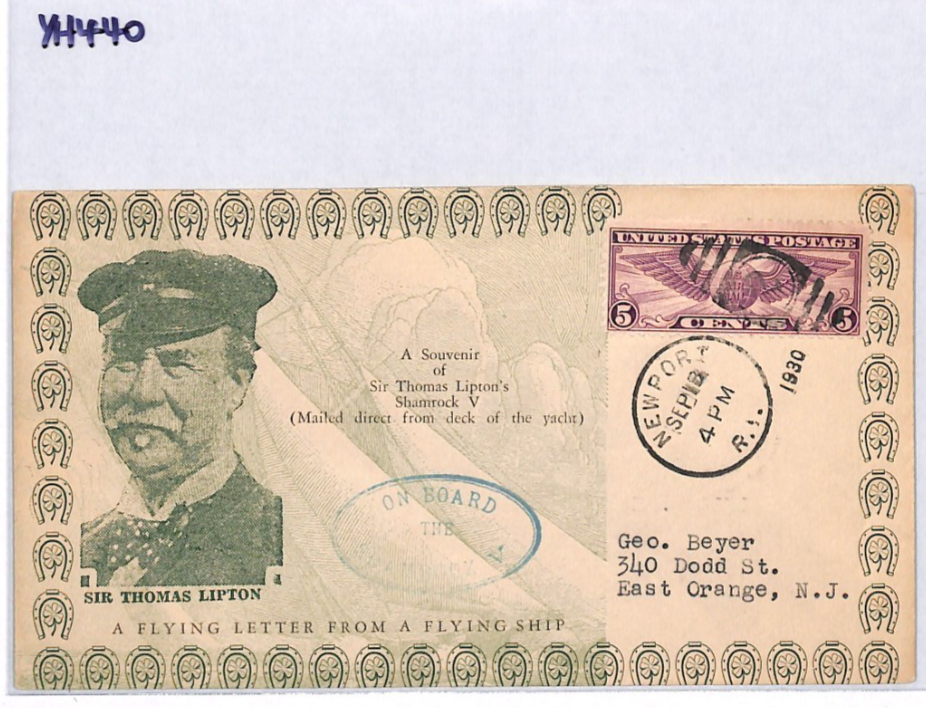 USA Cover 1930 GB SAILING *Shamrock V* YACHT Thomas Lipton TEA TYCOON YH440