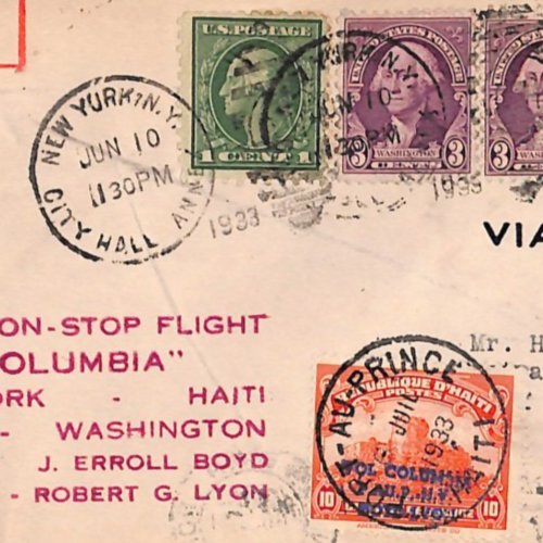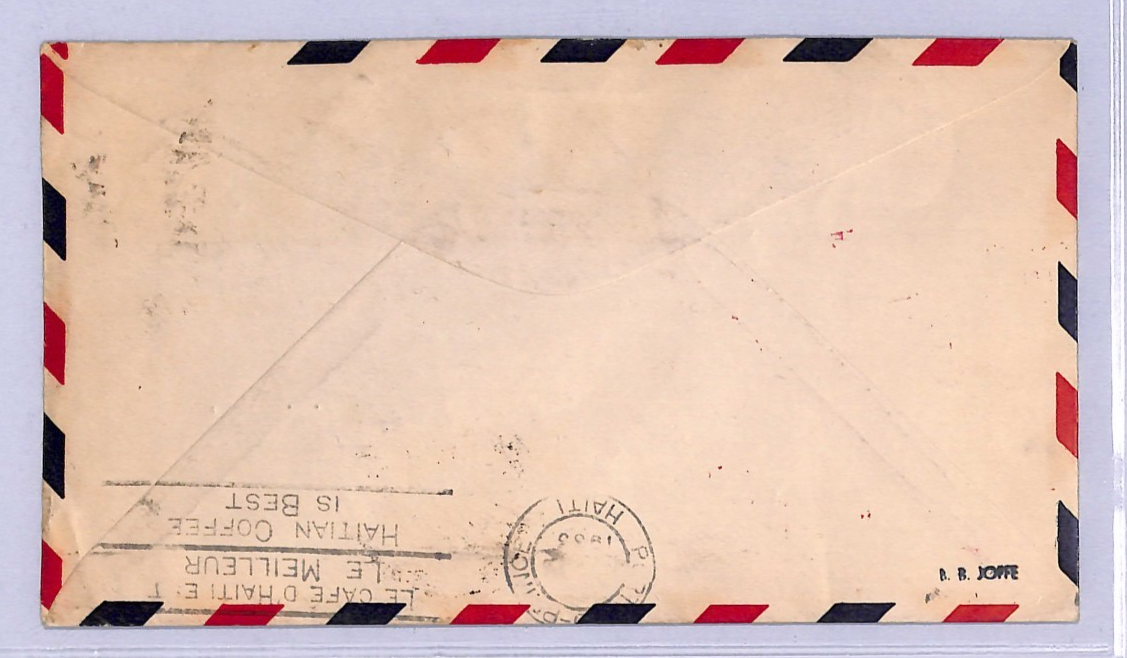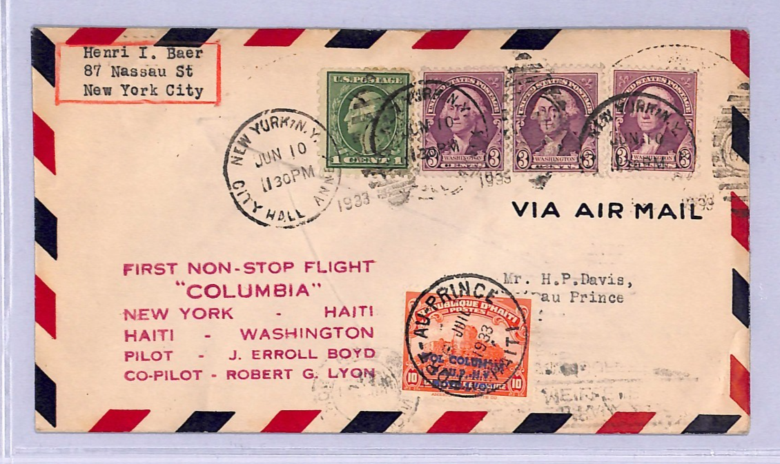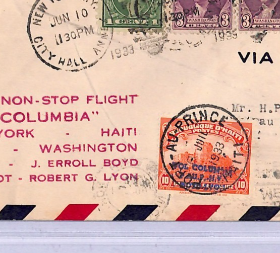 HISTORICAL AVIATION ITEM. First NON-STOP Haiti flight. Note UNLISTED/UNAUTHORISED "MISS COLUMBIA" FLIGHT OVERPRINT in blue *VOL COLUMBIA/NY/BOYD LYON* on Haiti 10c CITADEL stamp. Well tied. VERY RARE AIRMAIL STAMP used in addition to this First Flight rated at 10,000 points by Muller. Believed fewer than a dozen examples recorded of this overprinted Air Mail stamp. Very Fine for an item of this type & period. Please look at all the scans to help form your own opinion (WAF). PIONEER AVIATION, USA & HAITI EXHIBITION ITEM.