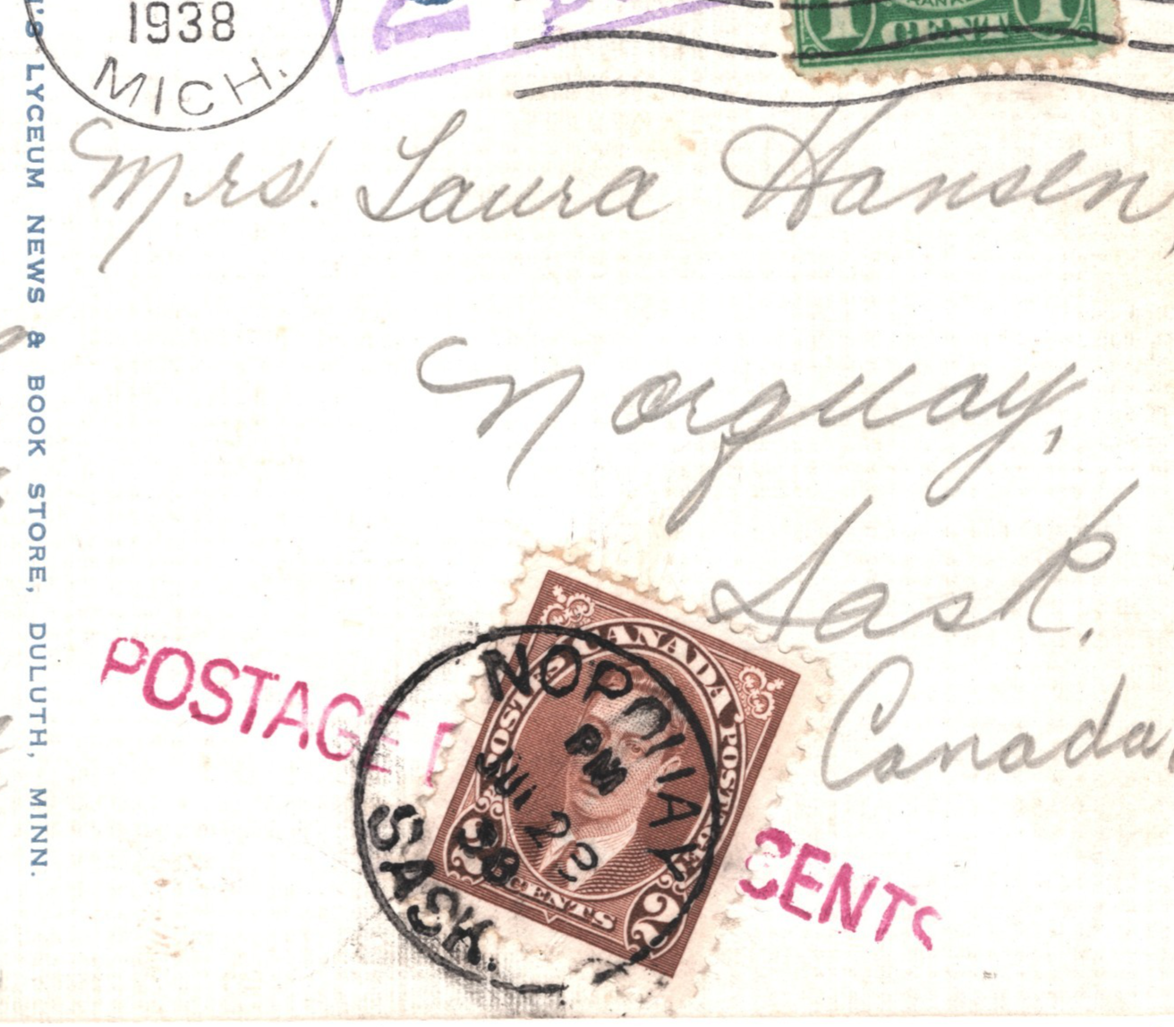 USA MI Postcard CANADA 2c DUE Paid KGVI *POSTAGE STAMP* Norquay SASK 1938 XK121