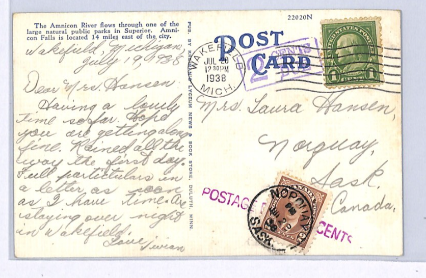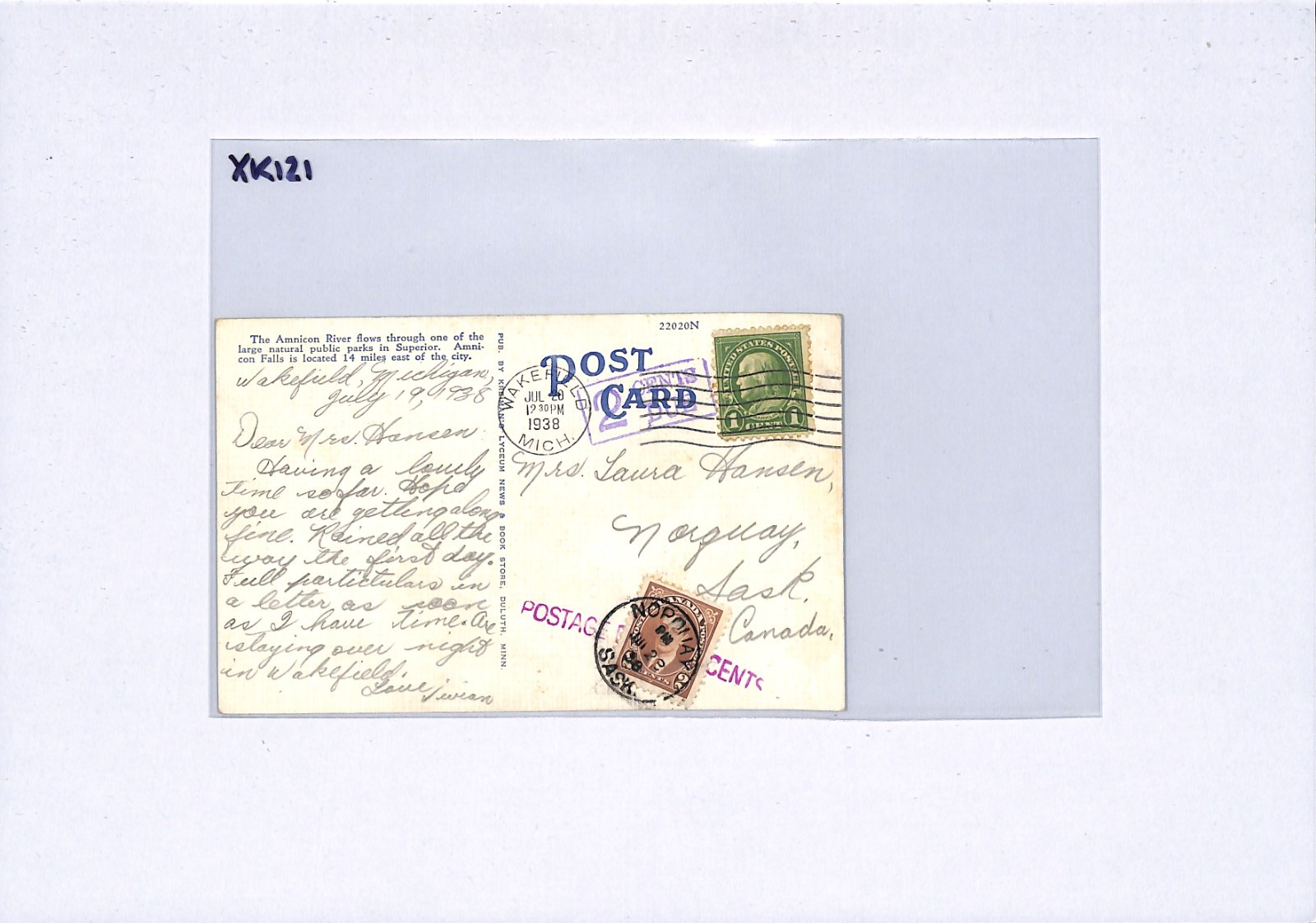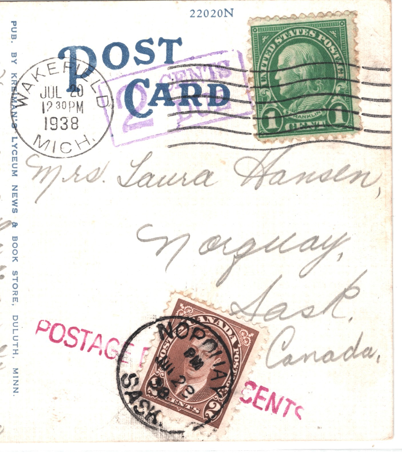 USA Wakefield MI Postcard CANADA 2c DUE Paid KGVI *POSTAGE STAMP* Norquay SASK 1938 XK121