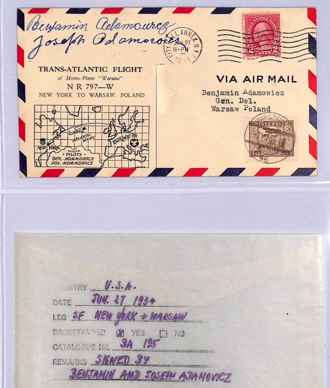 VERY SCARCE ITEM. Historical Transatlantic Flight cover SIGNED BY BOTH PILOTS (BENJAMIN & JOSEPH ADAMOWICZ). Very Fine for an item of this type & period. Please look at all the scans to help form your own opinion (WAF).