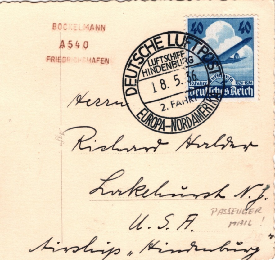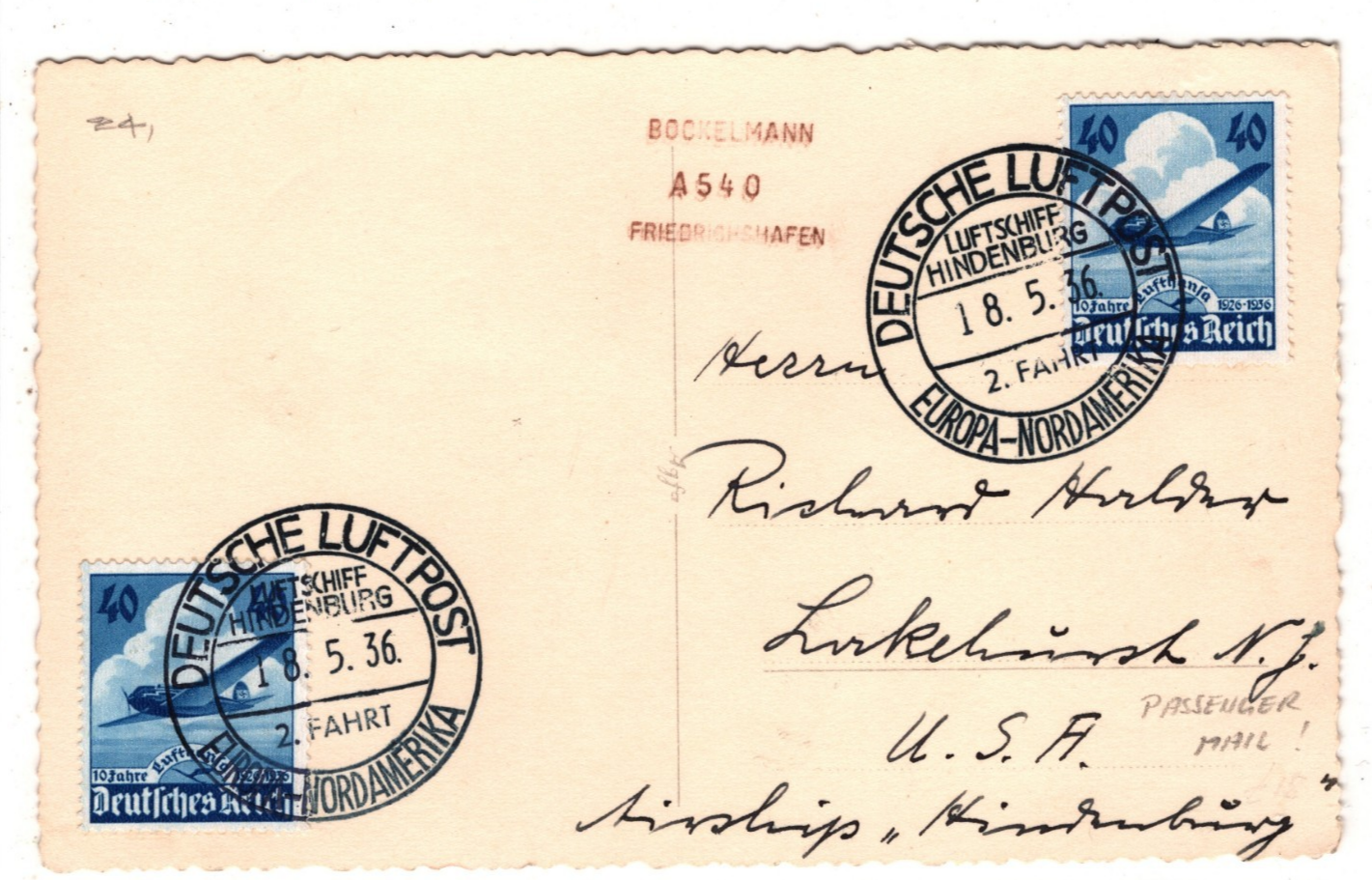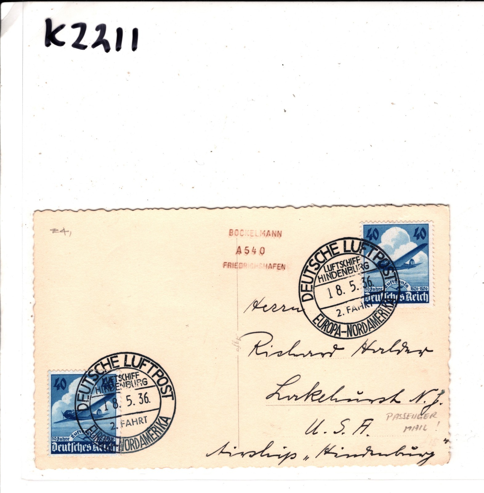 ZEPPELIN HINDENBURG 1936 Card Air Mail *2 FAHRT* USA Lakehurst Germany KZ211