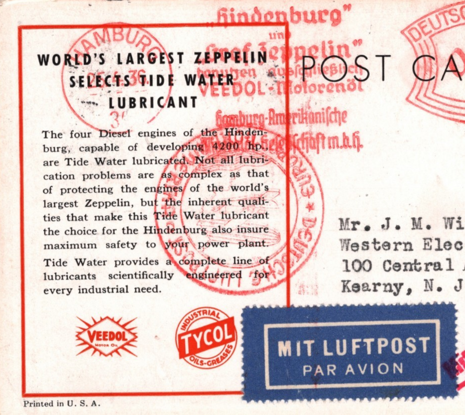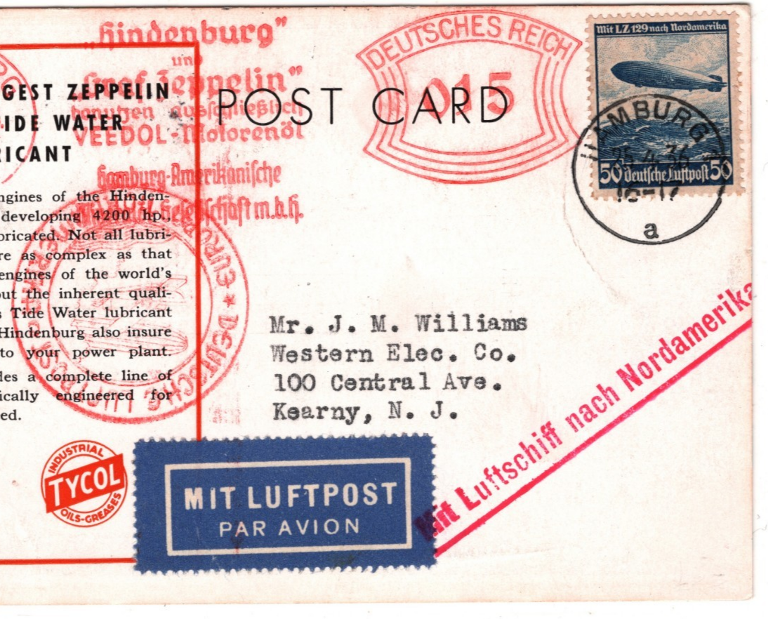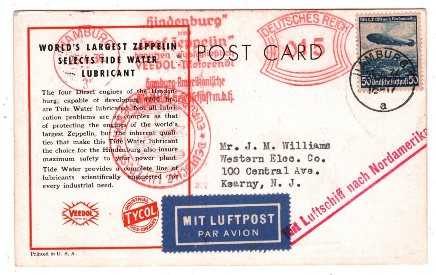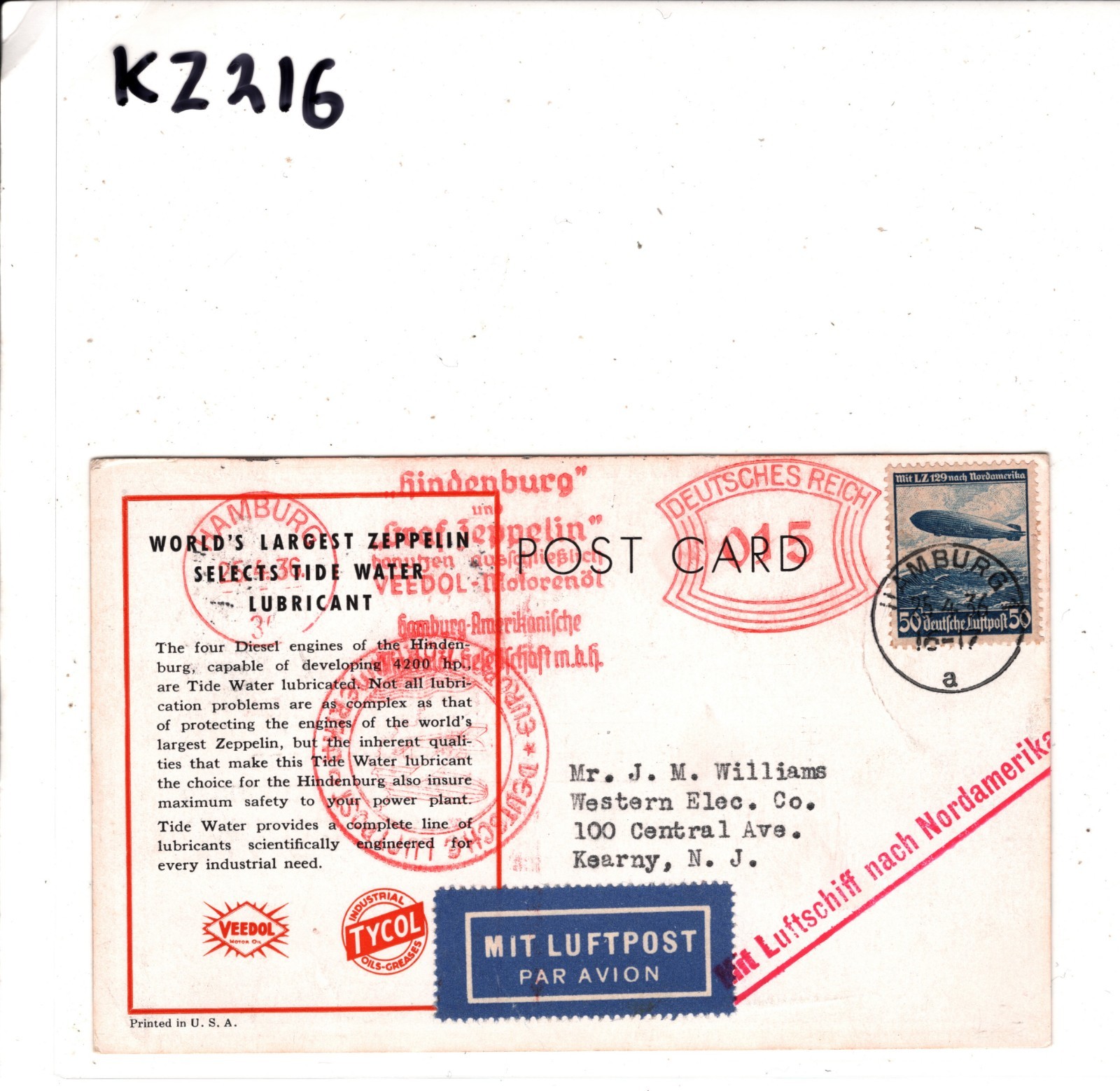 ZEPPELIN HINDENBURG 1936 Card Air Mail Advert USA NJ Kearny Germany KZ216