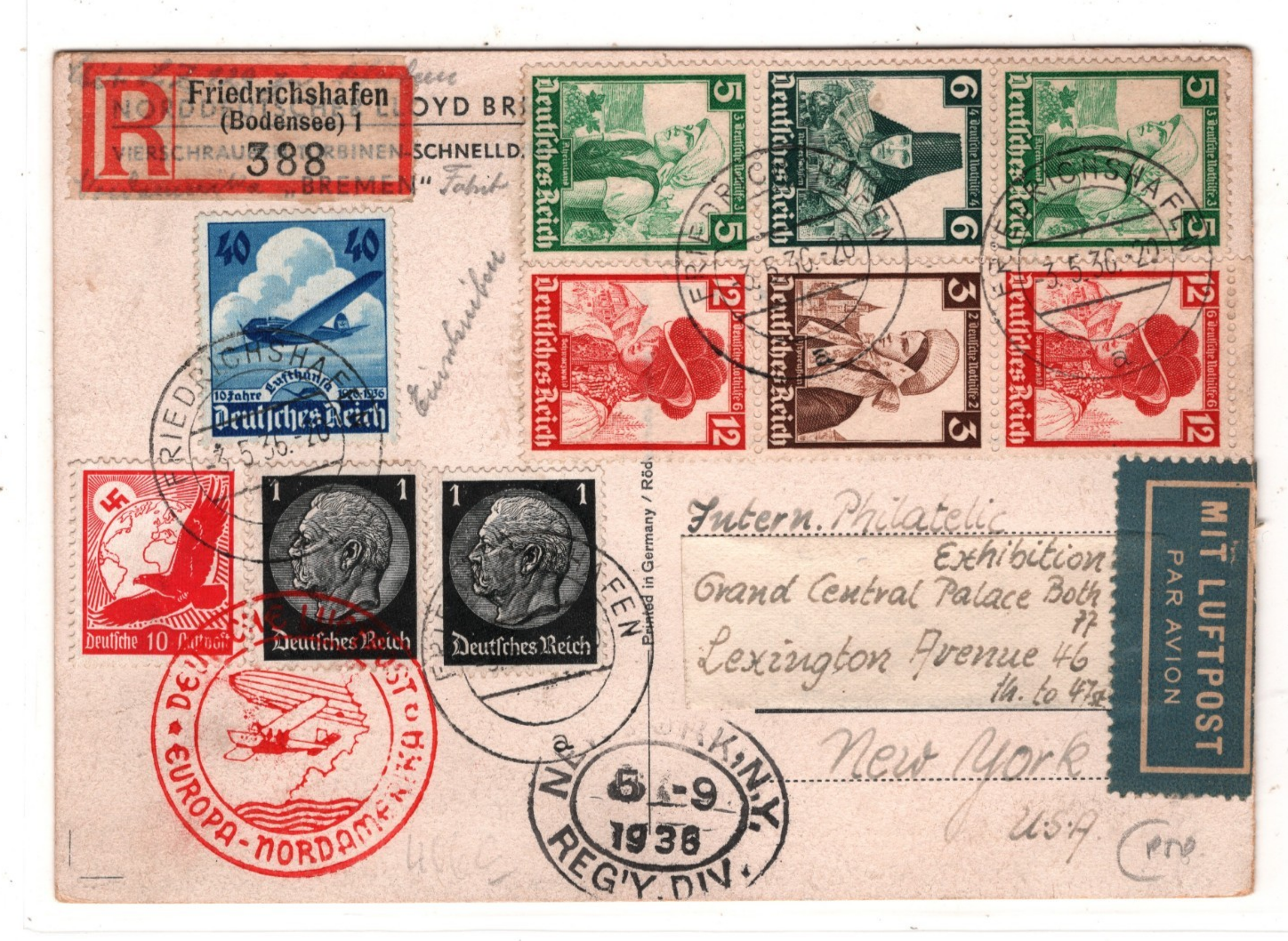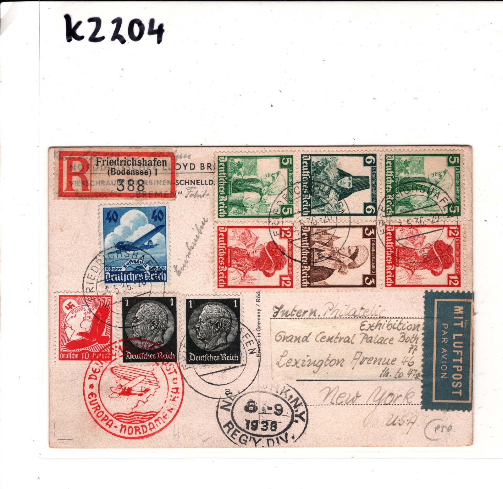 ZEPPELIN HINDENBURG 1936 Card Air Mail USA New York Registered Germany KZ204